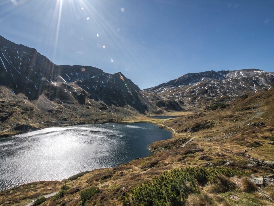 After your overnight stay at Giglachseen lakes - either Ignaz-Mattis-Hütte or Giglachseehütte - you start out on trail n° 702 and walk along the Giglachseen Lakes on trail n° 702. At the Northeast shore of the bigger Giglachsee Lake you reach the trail junction with trail n° 776 which you follow for a bit and then continue on trail n° 775 along the slopes of Grobfeldspitze, Giglachalmspitze and Murspitzen. Via Murspitzsattel mountain saddle you reach Ferchtlhöhe ridge from where you get a great view of Duisitzkarsee Lake.