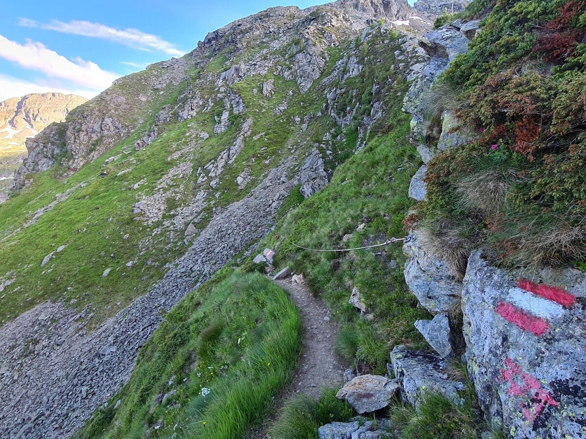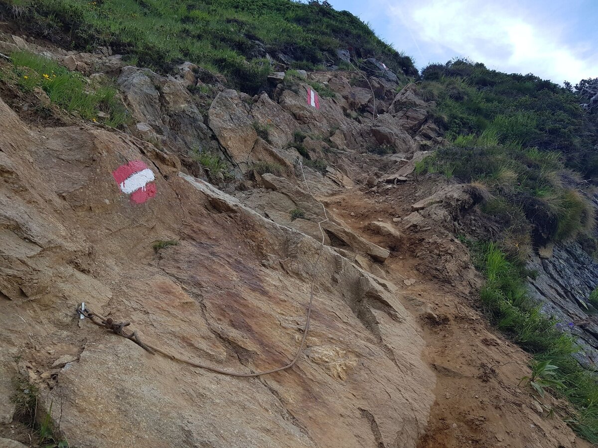 Alpine trail crossing a steep mountain face. Quite steep descent from Ferchtlhöhe ridge into Duisitzkar cirque.