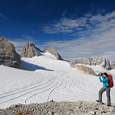 A fascinating glacier walk to the largest kolk of the Eastern Alps: a large snow ridge surrounds the "Dirndl" which rise like a ship bow from the glacier.  Go straight ahead towards the Dachstein and the groomed track will lead you to the Seethalerhütte. This mountain hut was originally built as a mountain shelter for mountaineers and offers a stunning view of the Dachstein Südwand (south face). Walk back the same way.