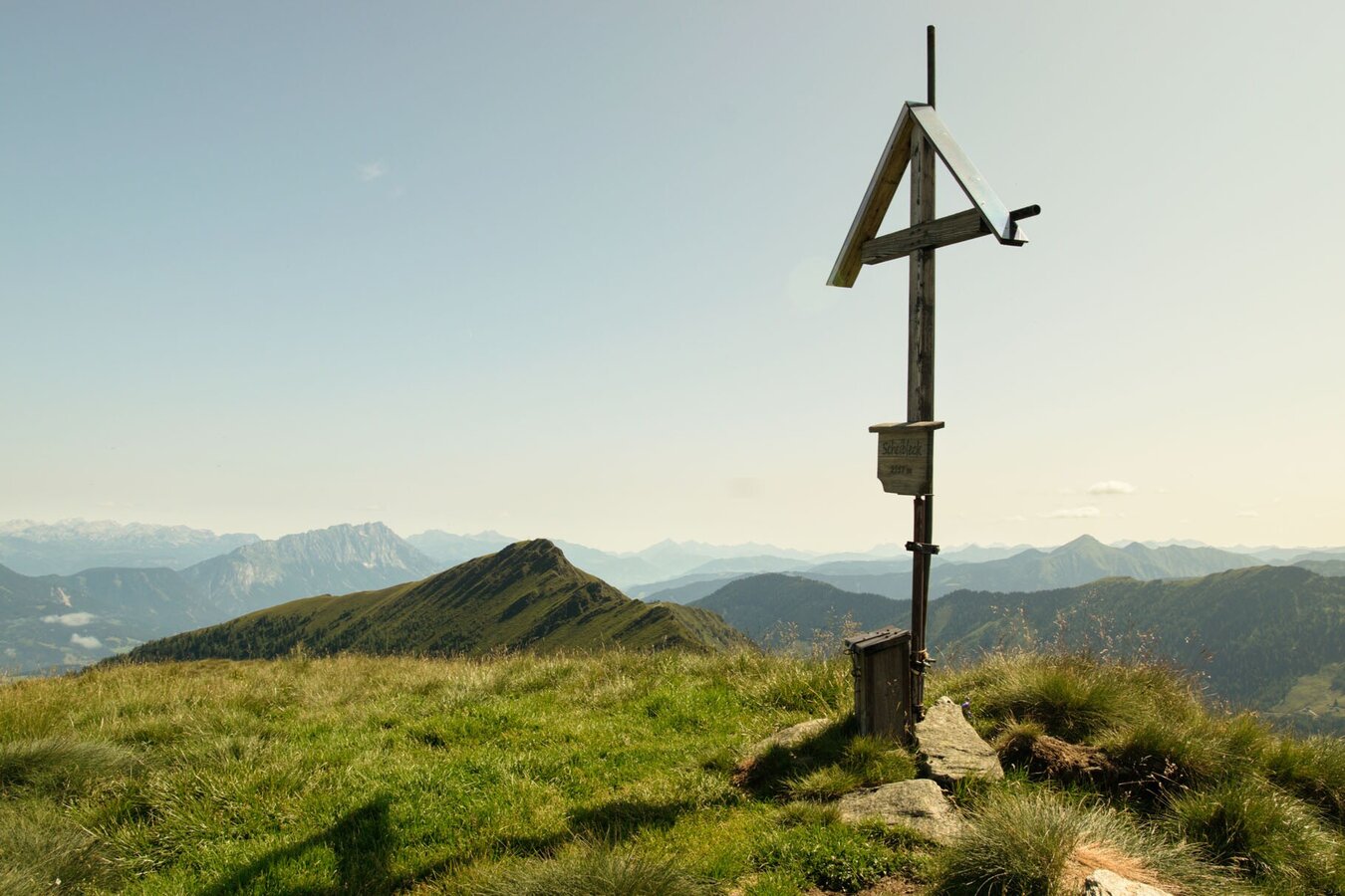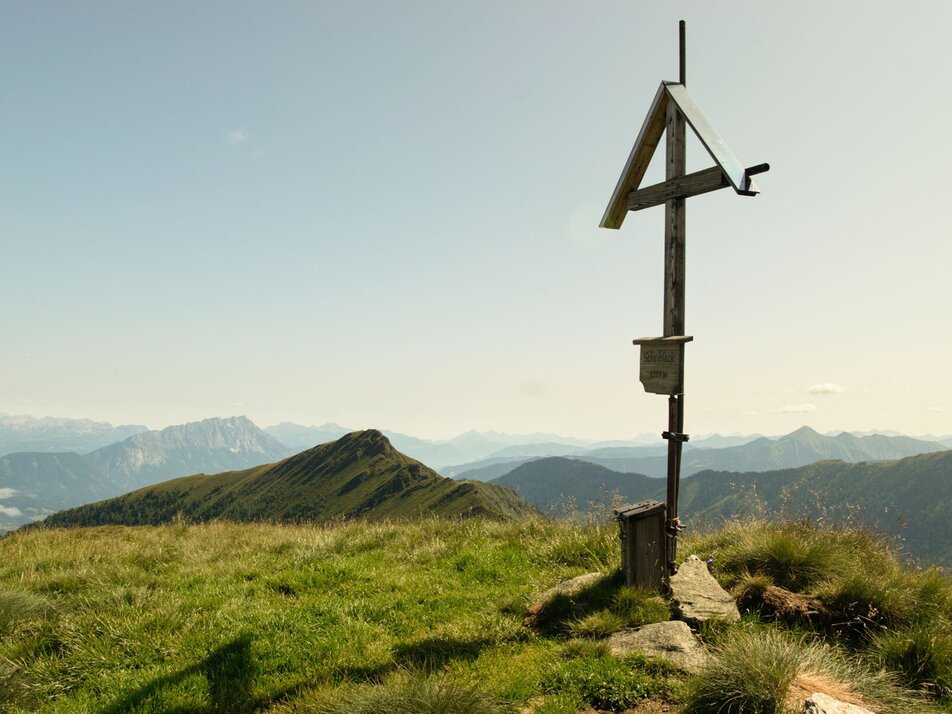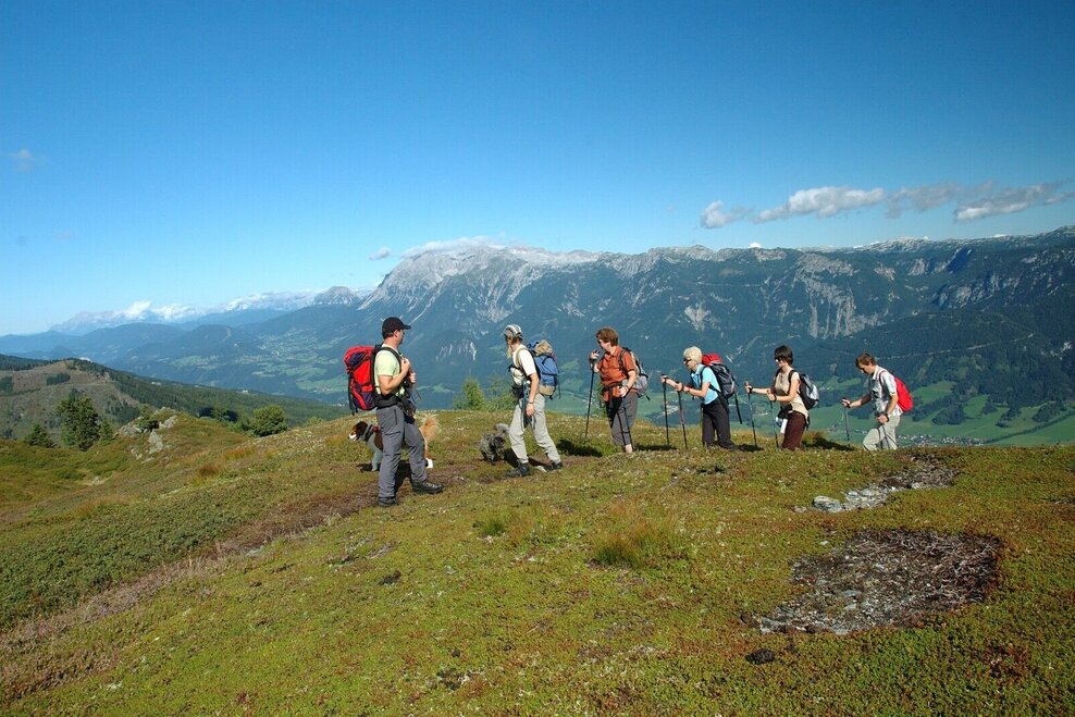 Surprisingly nice is the view from the Ochsenkarhöhe: Pleschnitzzinken, Sattental, Gumpeneck, Hochwildstelle, Bischofsmütze, Dachsteinkette, Totes Gebirge, Ennstaler Alpen, TauernBotanical highlights: Almrausblüte in the first half of July, blauer Eisenhut in August, great autumn colors of the surrounding forest in autumn