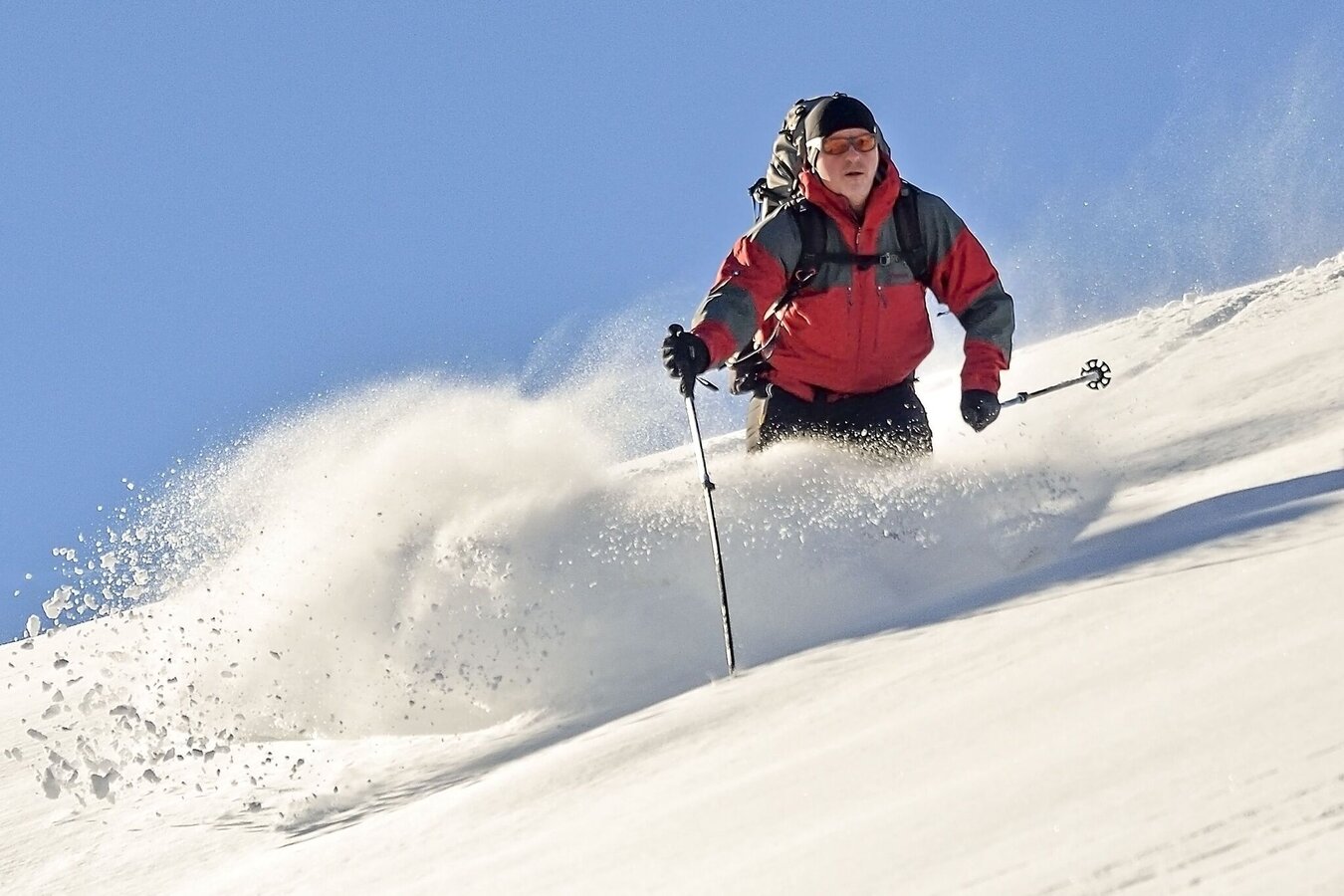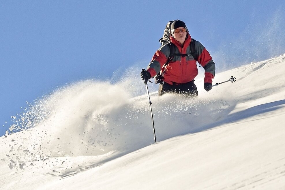 - Avalanche beacon, probe and shovel are essential in open terrain.