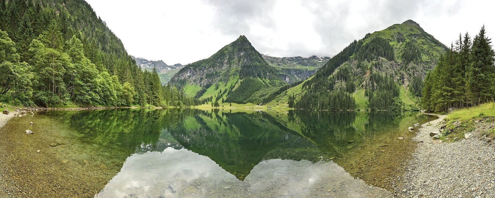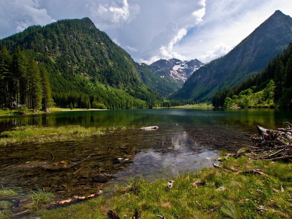 The further we drive into the Kleinsölktal, the more imposingly the steep forested hillsides ascend towards the peaks above. From the Breitlahn Hütte, a broad path takes us on an almost flat walk alongside the Kleinsölk stream to the Schwarzensee. Three sides of this lake are surrounded by dark forest, standing along the shore are a number of enormous, ancient alpine maples. And in good weather, whenever we come to a clearing, we can enjoy enchanting reflections off the lake.