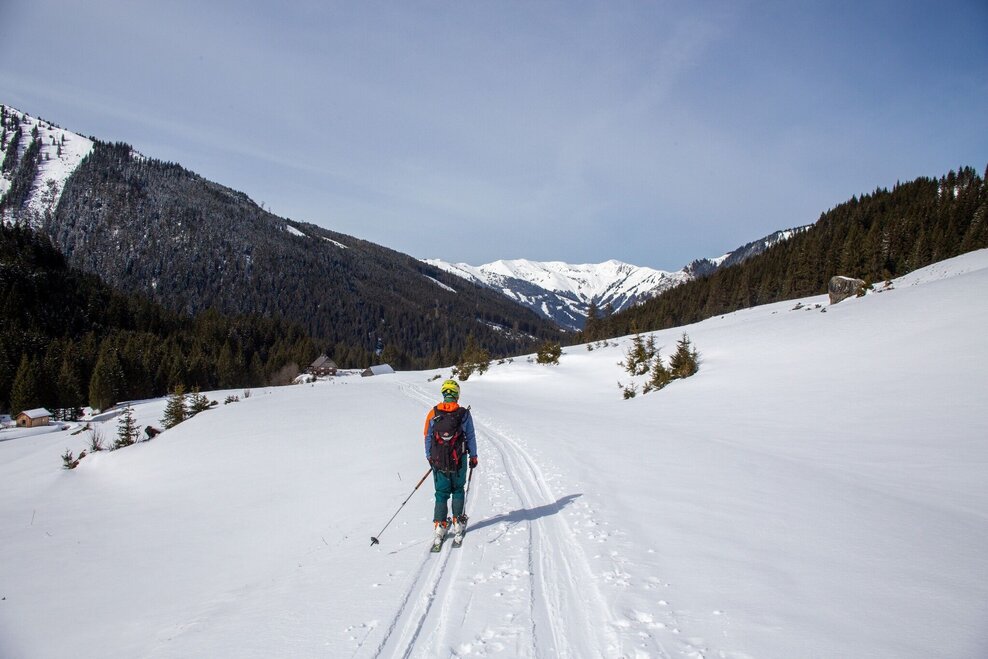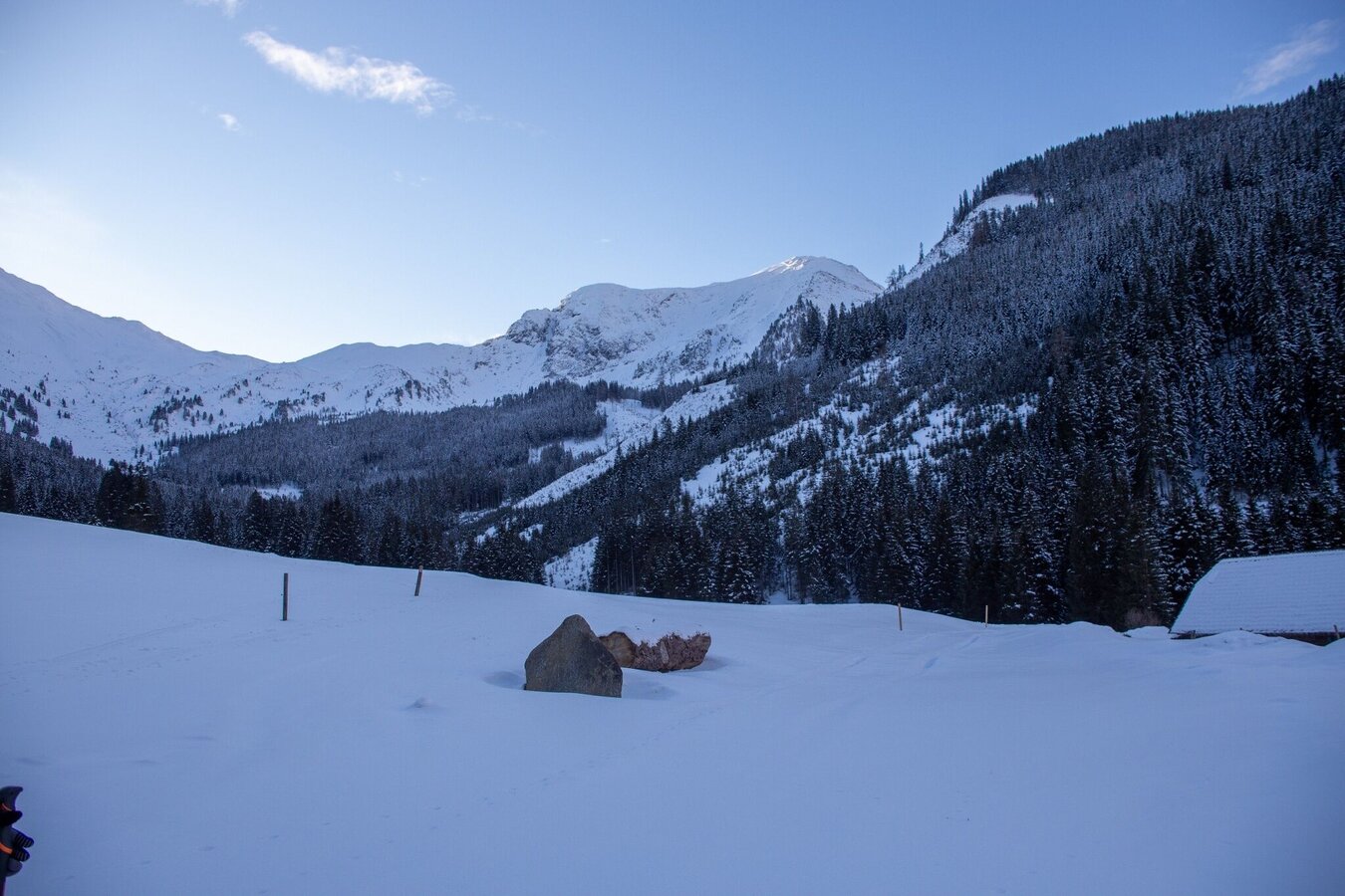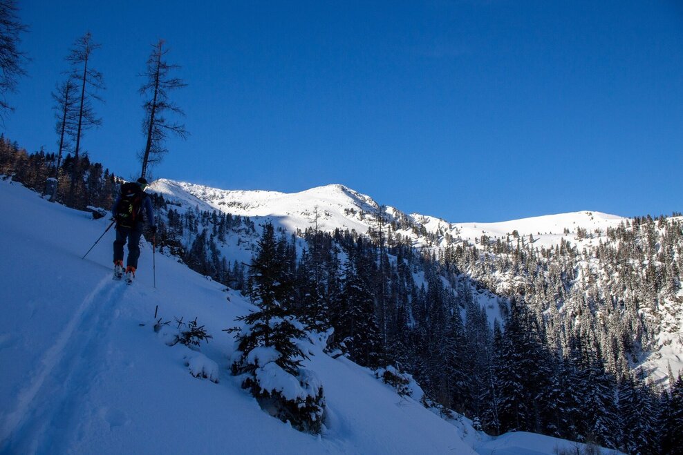 From the barrier you start on a flat forest road in the direction of Riedleralm. You can expect a very flat 2.7 km to the Riedleralm. Now you follow the left forest road and turn right after about 200 meters - so you avoid the wildlife feeding. Afterwards, again on the forest road, you will pass the Beireut Alm. One kilometer after the mountain pasture, keep to the right and stay on the forest road for another 2.3 kilometers. On your right is now an open forest area, over which you climb to a flat ground. Below the Schattenkogel again to the right, you climb in hairpin bends up to the first ground at 1850 meters above sea level. Now, keeping to the right, you bypass the steep step in front of you and track flat towards the south. The second steep step can be bypassed on the right in icy conditions. Steepening you climb up to the ski depot - depending on snow conditions - at about 2280 meters. Do not lay the ascent track too far to the south. There is usually a very large cornice that is not immediately visible. From the ski depot it's now an easy, but exposed climb to the summit. Here crampons may be necessary.