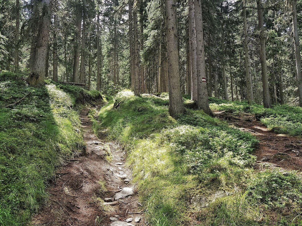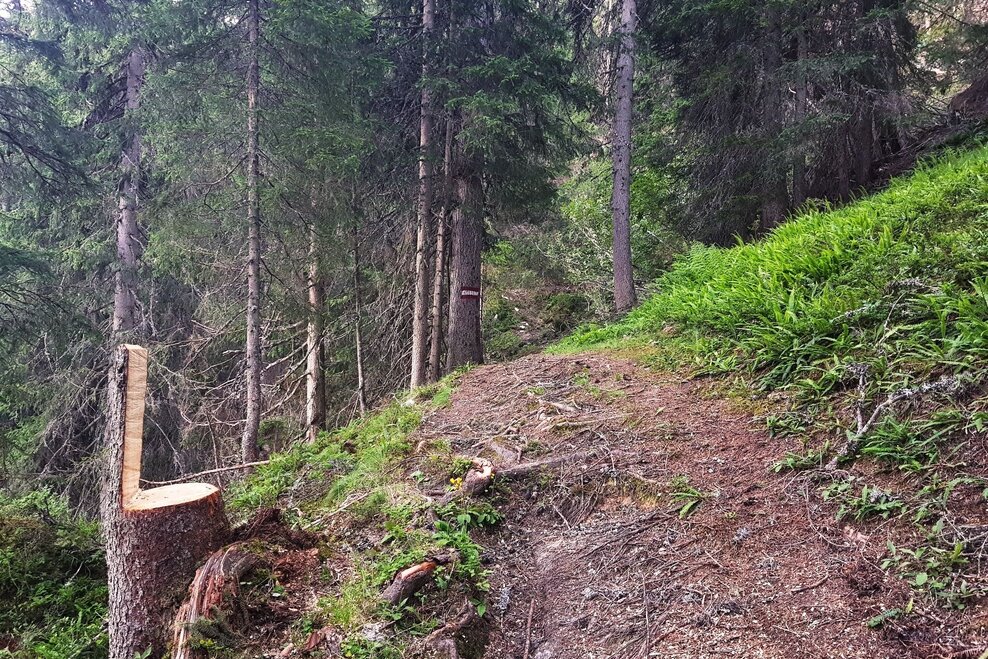 Eventually you run across a forest lane (hiking trail #773 and Laubschachen Trail join your route here from the right) and further downhill into a large clearing in the forest. You then reach another forest lane, right at a sharp bend in the road. This road (trail #61) takes you directly back to the valley terminal of Hochwurzen cable-car.