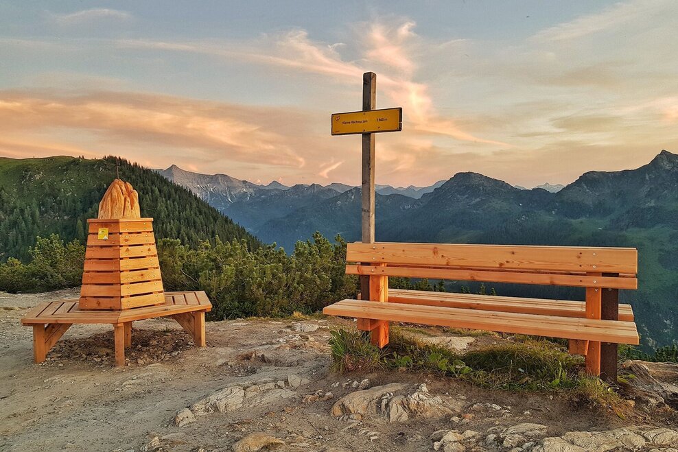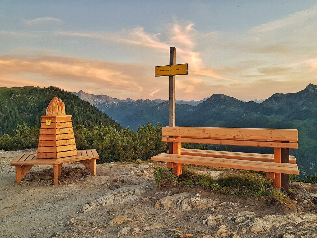 From the top you first continue along trail #60 ("Bankerlweg") passing by below Hochwurzenhütte on the East slope. On the right side of Hochwurzenalm you run up to "Kleine Wurzen" summit. The trail now takes you downhill through a dwarf pine and larch forest until you reach the 4-seasons-trail (at the forest lane). Follow it to the right, which takes you towards Hüttecksattel mountain saddle. At the 1st trail intersection (after about 150 m) on the mountain saddle you keep left (towards Rossfeld). Shortly after you reach the 2nd trail intersection where you now branch off left on trail #61 towards Rohrmooos and Obertal. Through the timber forest you now run downhill.