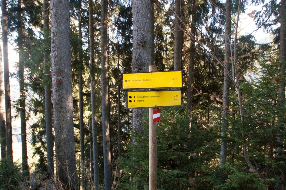 Your starting point is at the valley terminal of Hochwurzen cable-car. Passing by the terminal on its right you start your run uphill on trail #60. After about 250 meters you turn off left at the mountain terminal of Rohrmoos II chairlift. Eventually you run up through the forest and across an alpine meadow (a ski slope in winter) and on to the intersection of trail #60, located within a forest clearing. Here you continue left and further uphill (to the right Bernhard Knauß Trail branches off here).