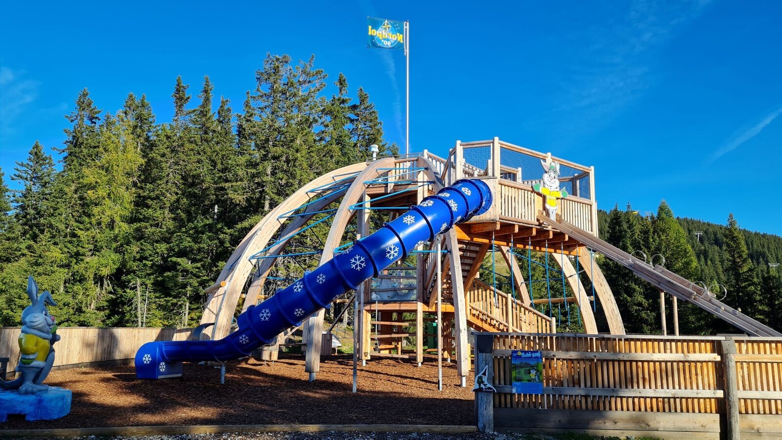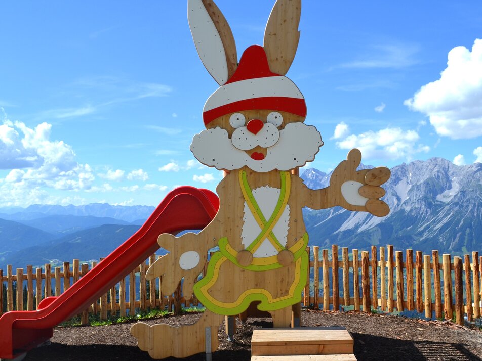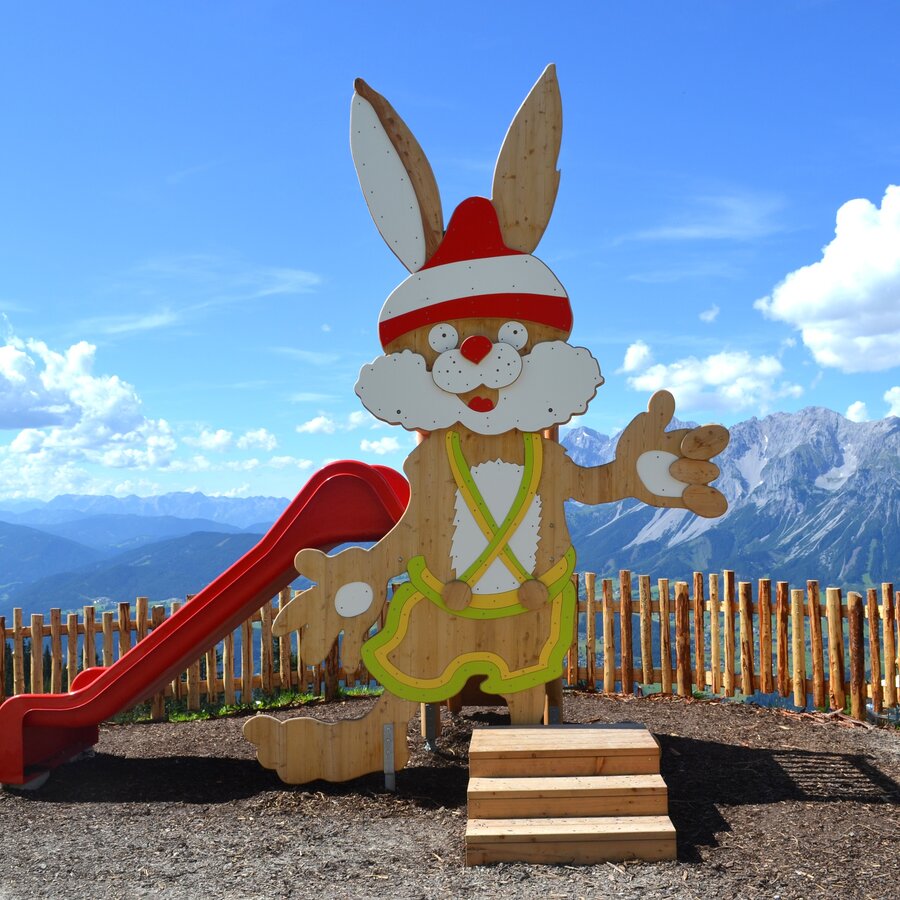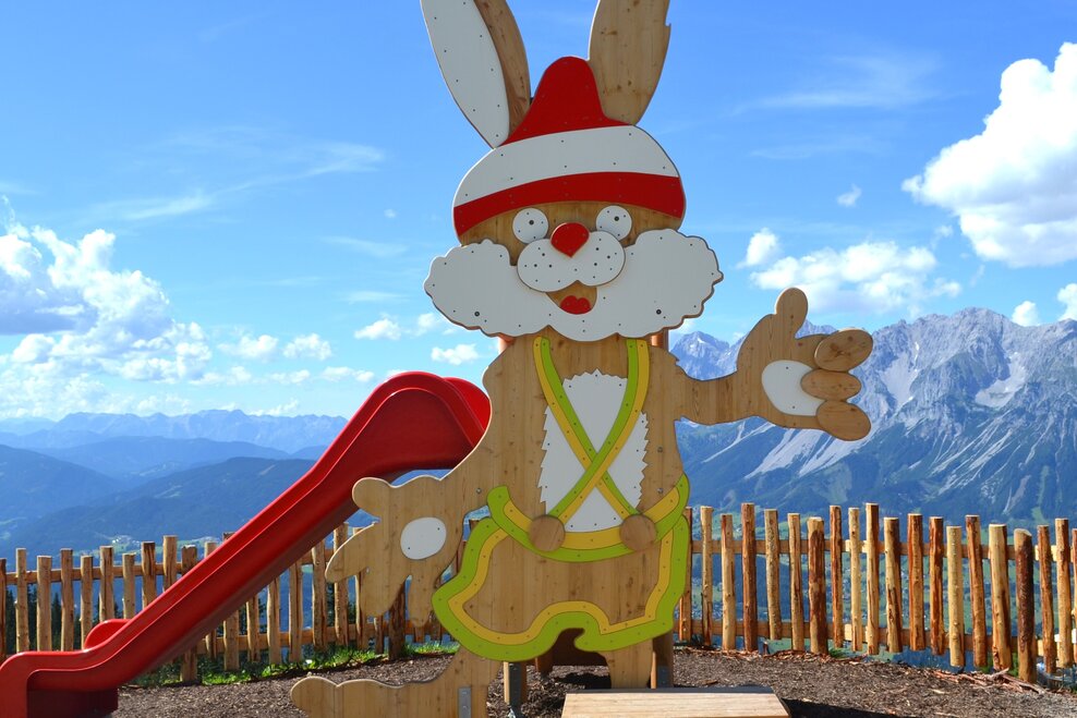 You continue across mountain meadows (Hopsi's favorite ski slopes in winter) and through the sparse "carrot forest" to Hopsi's mountain sports world. There are also numerous play elements along the way. Past the Weitmoosalm we then head towards Onkel Willy's Hütte and the Schladminger Kristall.
