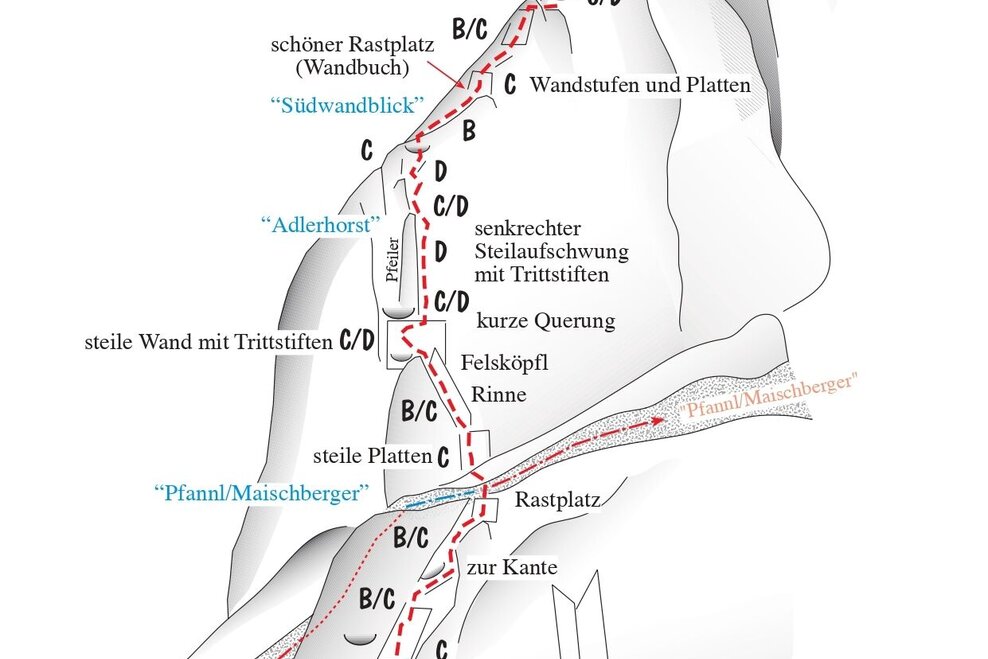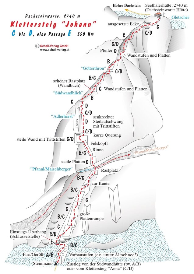 From the valley station of the Dacshtein cable car on the clearly marked hiking path leading to the Dachstein Südwandhütte. From there, drop briefly down towards the Tor, then branch off at the sign marked "Johann Klettersteig". A distinct trail leads to the first safety features of the via ferrata, which often lies beneath the snow. Another option: Make your way up via the Anna Klettersteig.
