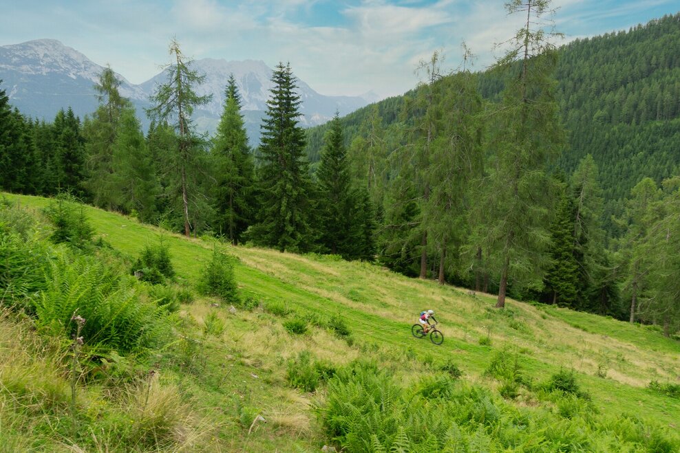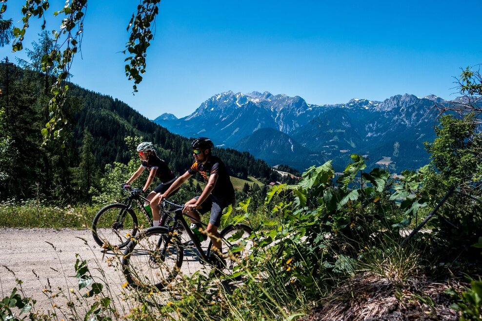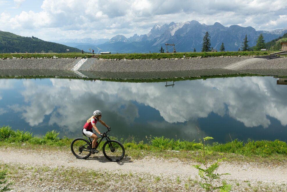 This challenging tour starts at the valley station of Hauser Kaibling, passes through the center of Haus, and then steadily climbs uphill via Oberhaus to the summit. After more than 1000 meters of elevation gain, you are rewarded with a breathtaking panoramic view of the Dachstein, the Grimming, and the Ennstal. The long descent leads through the Gumpental to the idyllic Styrian Bodensee and then gently back to the valley station – ideal for ambitious mountain bikers.