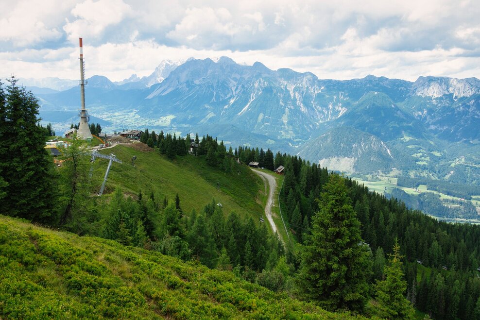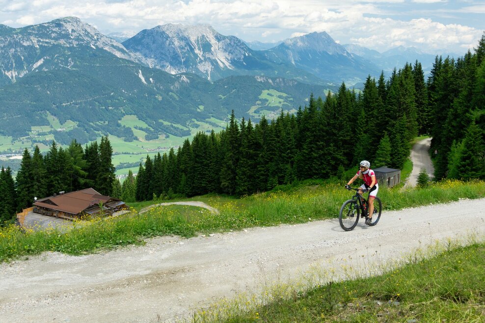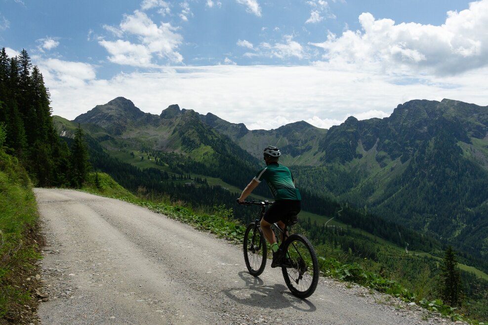The tour starts at the valley station of Hauser Kaibling (Sport Hauser Kaibling) and first leads into the center of Haus. Here, the long climb to Oberhaus begins. From there, the route continues on a well-maintained gravel path all the way to the summit. Those who conquer the more than 1000 meters of elevation gain are rewarded with a fantastic view of the Dachstein, the Grimming, and the Ennstal. At the top, several guesthouses invite you to take a well-deserved break.