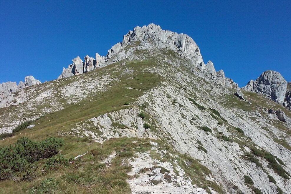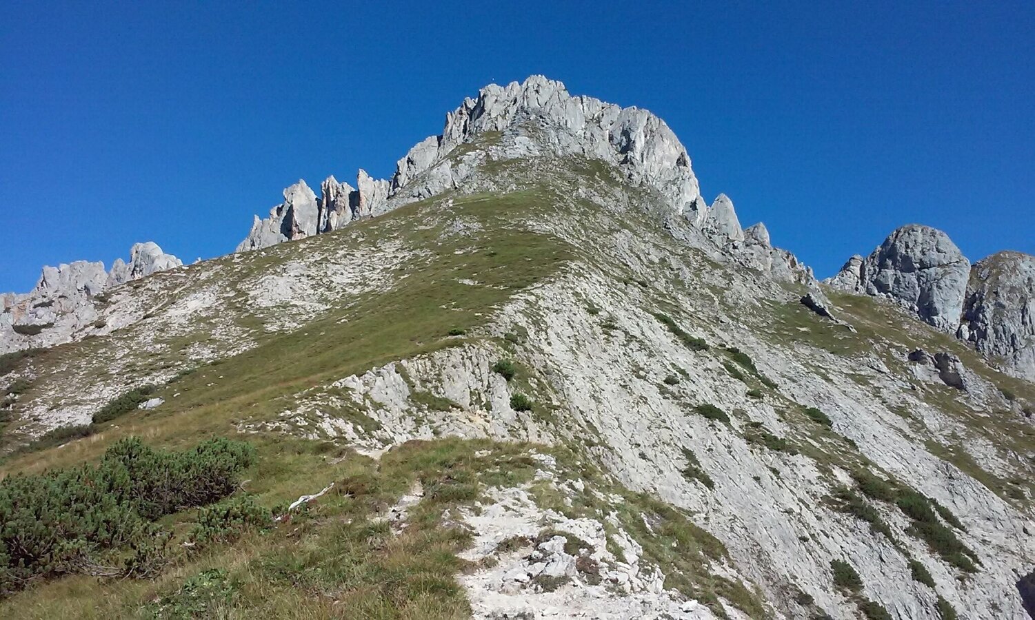 The path leads north of the peak down some secured steep steps, past Kammalm and continuing down until reaching the idyllic Miesbodensee (no. 28).