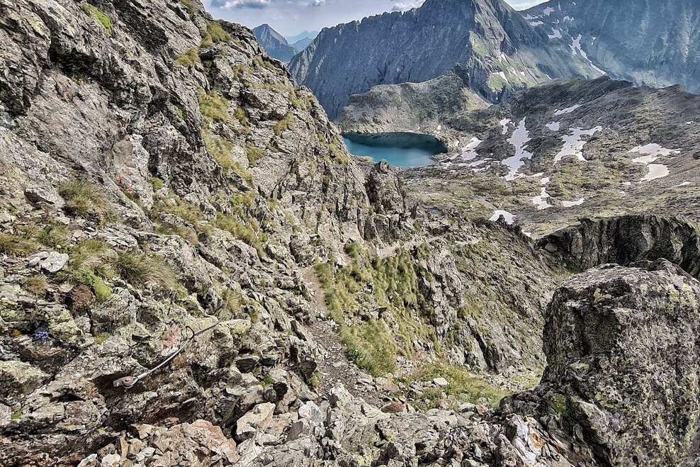 The further climb to the Greifenberg Mountain (2,618 m) is via a stepped scree. Towering above all, and framing the Klafferkessel, rise the flanks of the Waldhorn opposite and before them, in the green of the mosses, shine the scenic mountain lakes, large and small, scattered over various levels. Further East the pyramid of Hochwildstelle rises into the sky - below the green slopes of "Himmelreich" (Kingdom of Heaven). From the summit you walk, initially across crumbly land (Trail No. 702 – short stretch of safety ropes) on sharp hairpin bends downhill into the corrie.