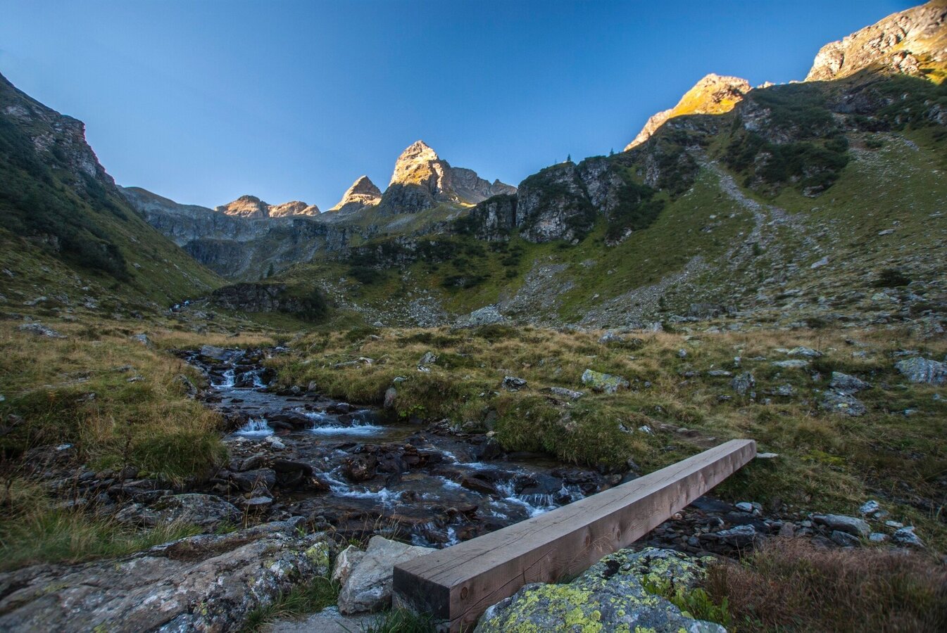 This majestic tour of the water trails "Wild Waters" takes you to Klafferkessel - a relic of the Ice Age - into the contryside of the high Alps. It is one of the most beautiful hikes in the Schladminger Tauern mountain range. Around 30 mountain lakes and trans in various sizes scatter across the lakeland at an altitude of 2,300 meters above sea-level. Almgasthaus Riesachfall, Gollinghütte, Preintalerhütte, Waldhornalm, Berallerhütte at Kotalm, Kaltenbachalm and Gfölleralm are the refreshment stops along the route. Between Gollinghütte and Preintalerhütte/Waldhornalm you need to cover 4 to 5.5 hours of walking without the possibility of stopping at a hut or chalet.