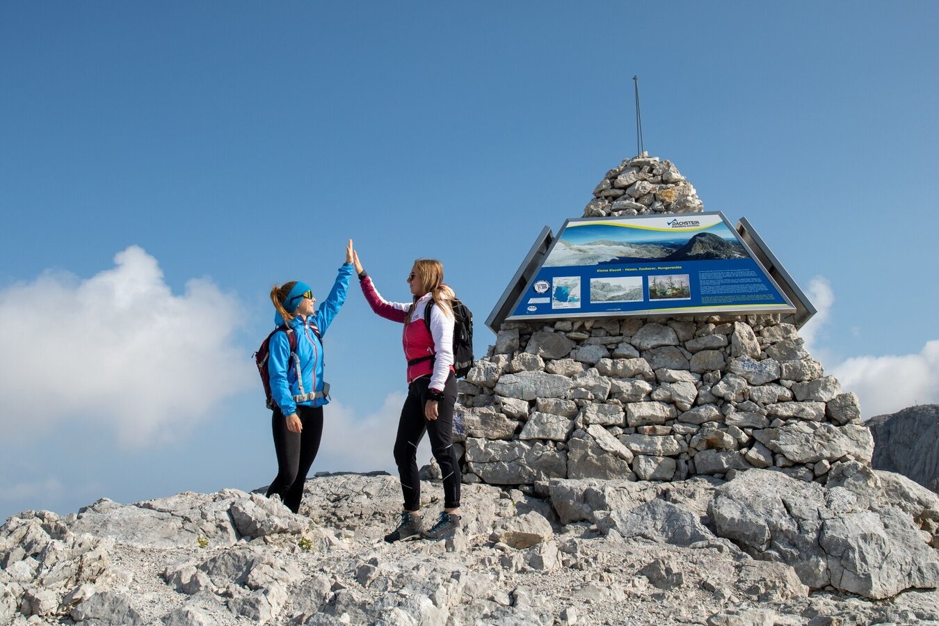 And when you reach your destination a summit pyramid awaits you along with a breathtaking view. The panorama panel modelled on a “Steinmandl” provides summit descriptions and exciting facts about the Dachstein glacier area. So why a “Steinmandl”? These little stone men have served since time immemorial as simple but practical waymarks in the mountains. And it is one of these little men who also marks your hiking destination on the Kleiner Gjadstein.