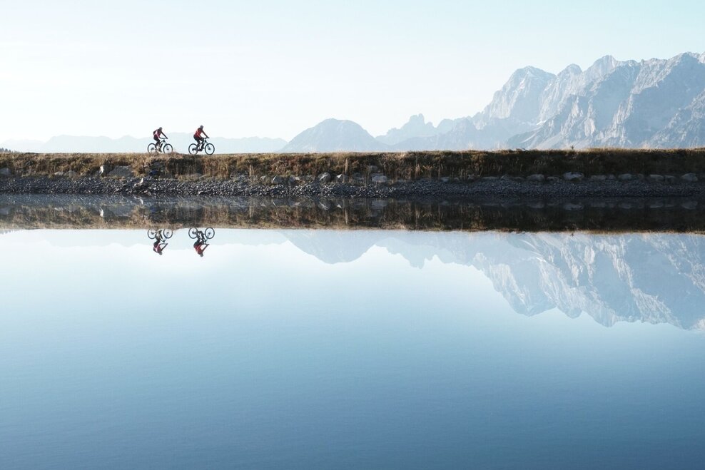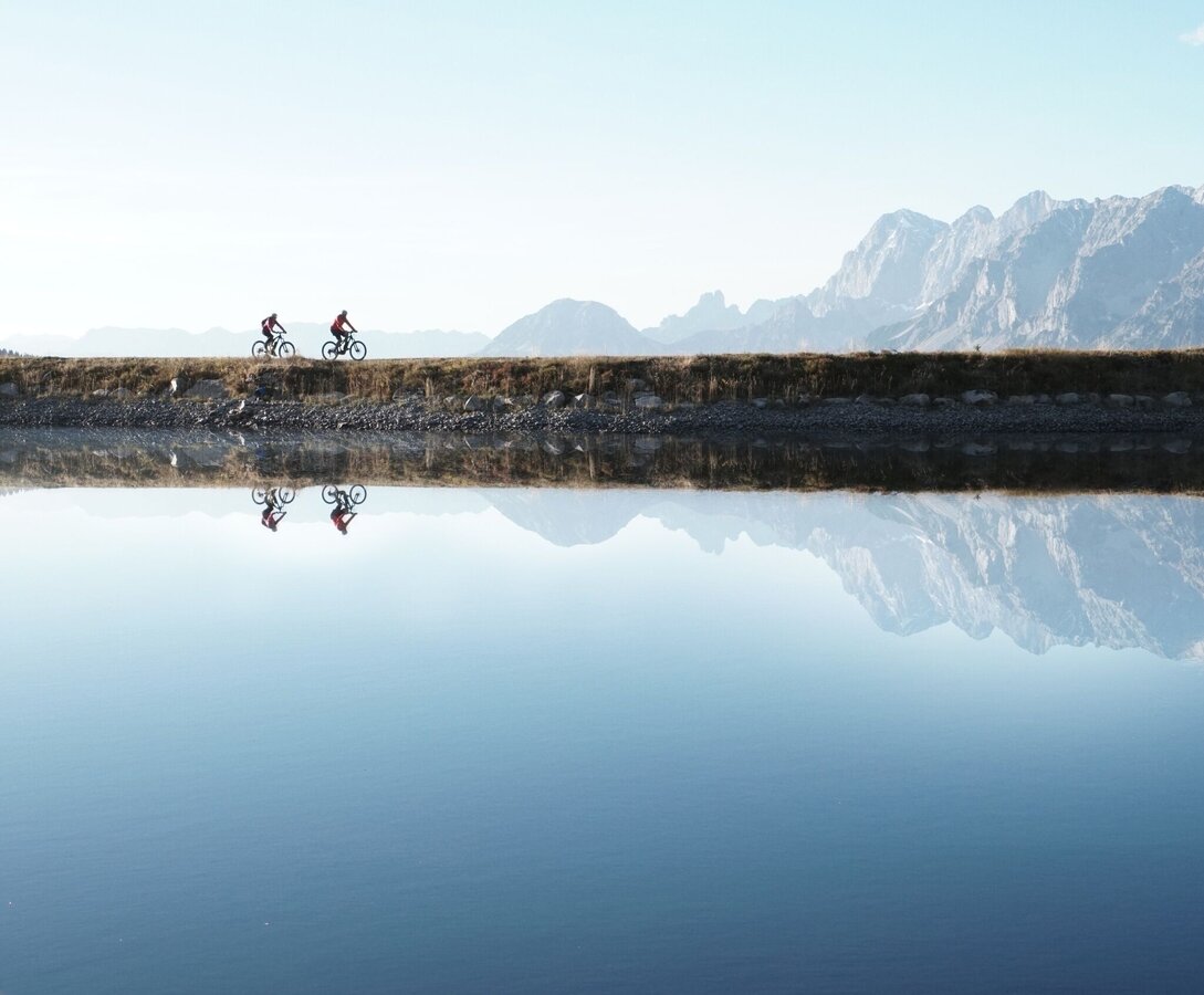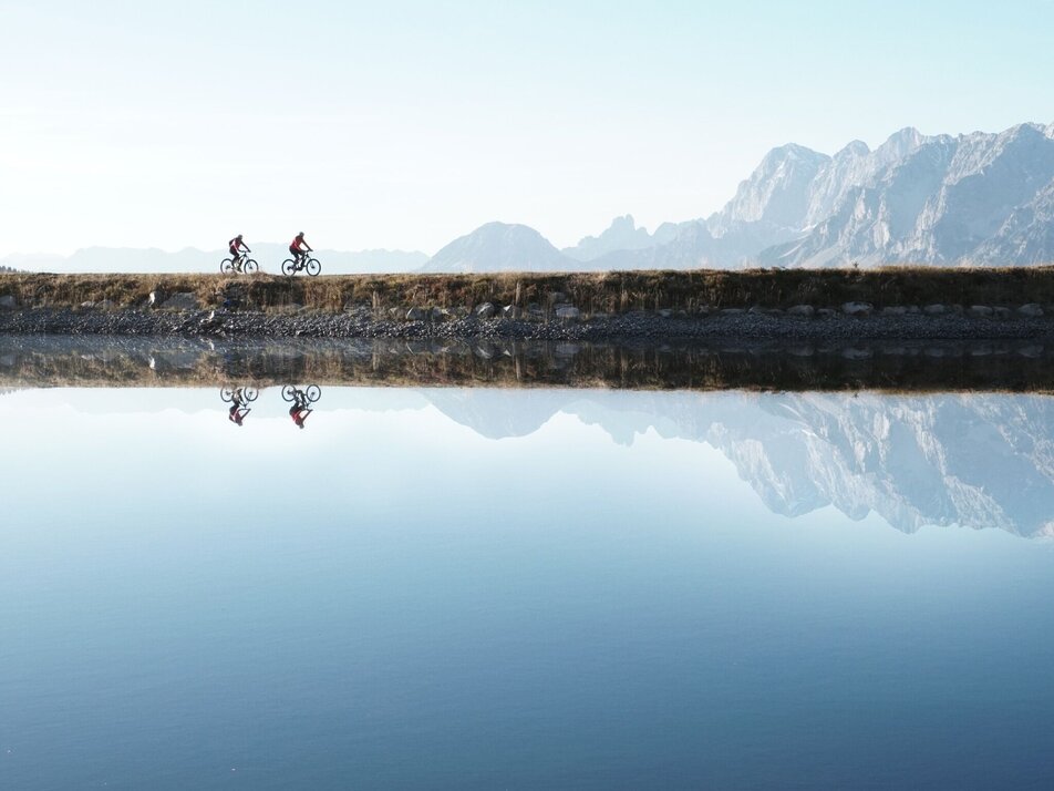 From here, the route descends slightly to the idyllic reservoir, where the sun terrace of the Kaiblingalm invites you to take a break. Here, you have two options for the descent: either enjoy the long ride directly into the valley or descend only halfway until you reach the signage for the Gumpental circuit. Following this route, you'll loop back to the mountain station – ideal for sporty mountain bikers looking for a varied circuit.
