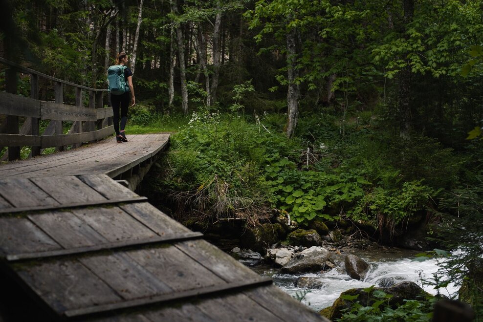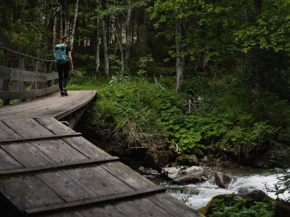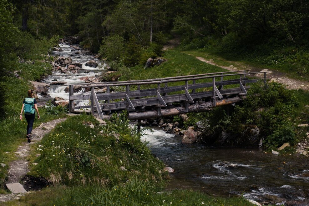 From the parking lot in Hinterwald you choose the entrance to the hiking trail to the left of the forest road and march along the torrent in a very relaxed way. Small bridges, rushing waterfalls and sunny spots add variety to the tour. At the wild animal feeding station, keep to the right and walk up the short climb to the power station. Now follow the forest path until you see the wide alpine landscape with the managed huts after the last piece of forest. Walk back along the same path.
