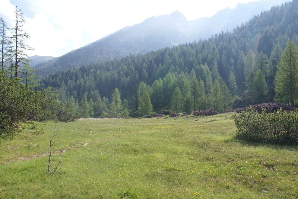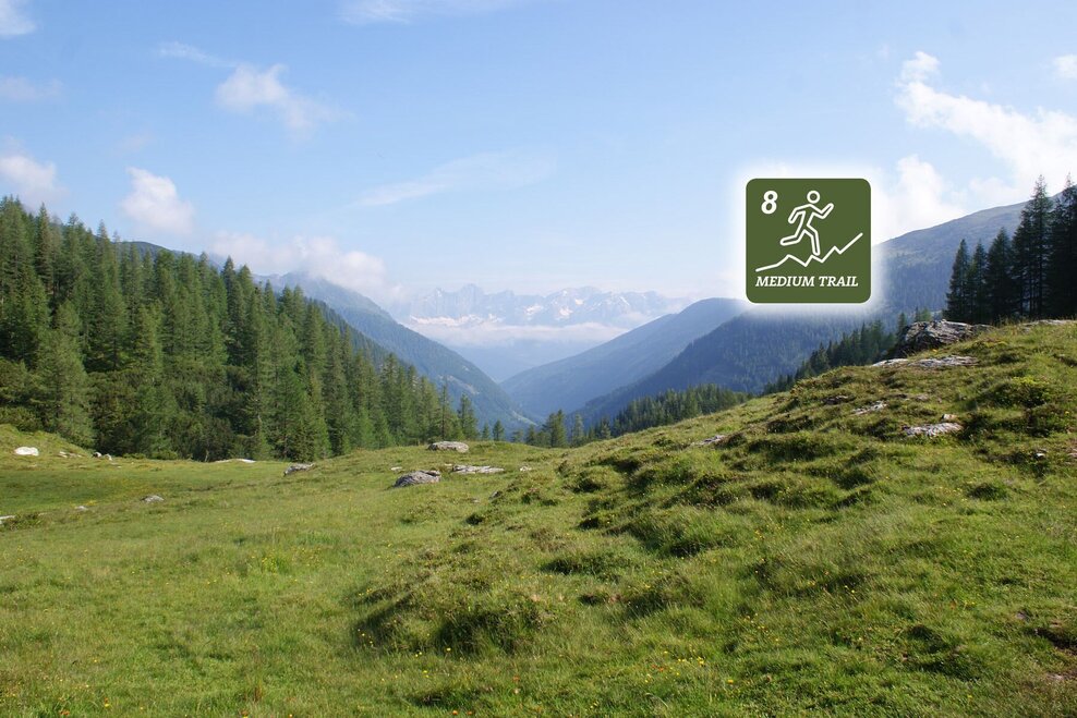 You start your run at Ursprungalm chalets, heading out of the valley along hiking trail #771, following the trail running signs with #8. The first section takes you across an alpine meadow, followed by about 1 km along a forest road. You continue through a longer section through the forest until you reach the alpine meadows around the Obere Moarhofalm chalet (private): take a look back to the valley head - the panoramic view with the summit of Steirische Kalkspitze is awesome!