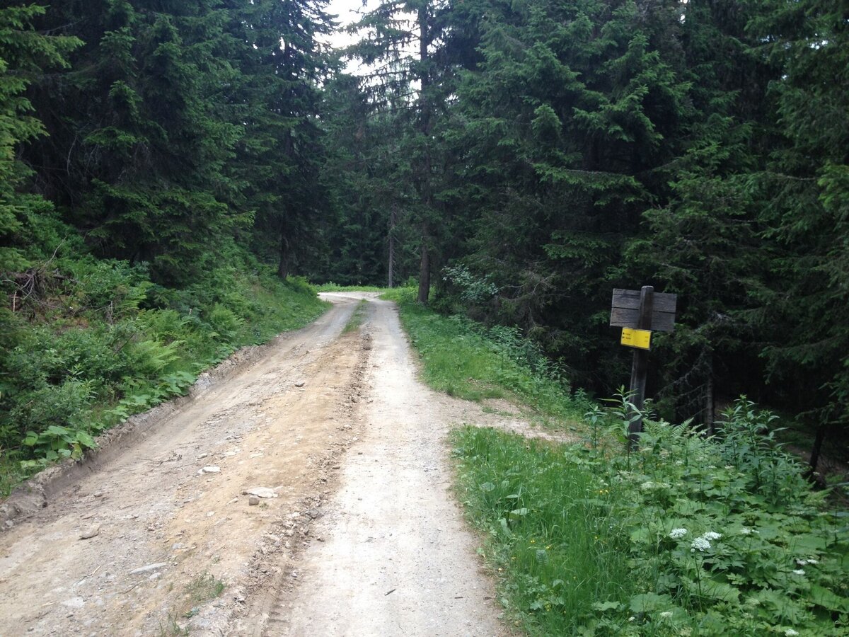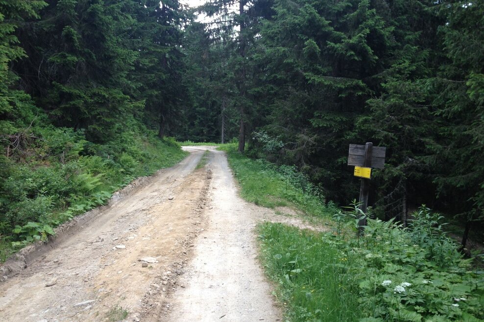 You run across the saddle (trail run #8 and hiking trail #773) now running downhill towards Rohrmoos (Waldfrieden). You lose elevation while you continue on hiking trail #773 and soon reach a forest road (called "Hochweg"), which you now run along for about 1.5 kms out of the valley. Eventually you reach the trail crossing where hiking trail #61 meets with trail #773. You make a right there and run downhill through the sparse forest, once again reaching a forest road at a sharp turn. Immediately after the curve you turn off right into the forest again (trail run #8 and hiking trail #773), running down a beautiful forest trail to the "Schwammerlstadt" ("mushroom town" - an attraction of the mushroom theme trail for kids). There you make a left and run - slightly uphill and along the mushroom trail - to the valley terminal of Gipfelbahn Hochwurzen.