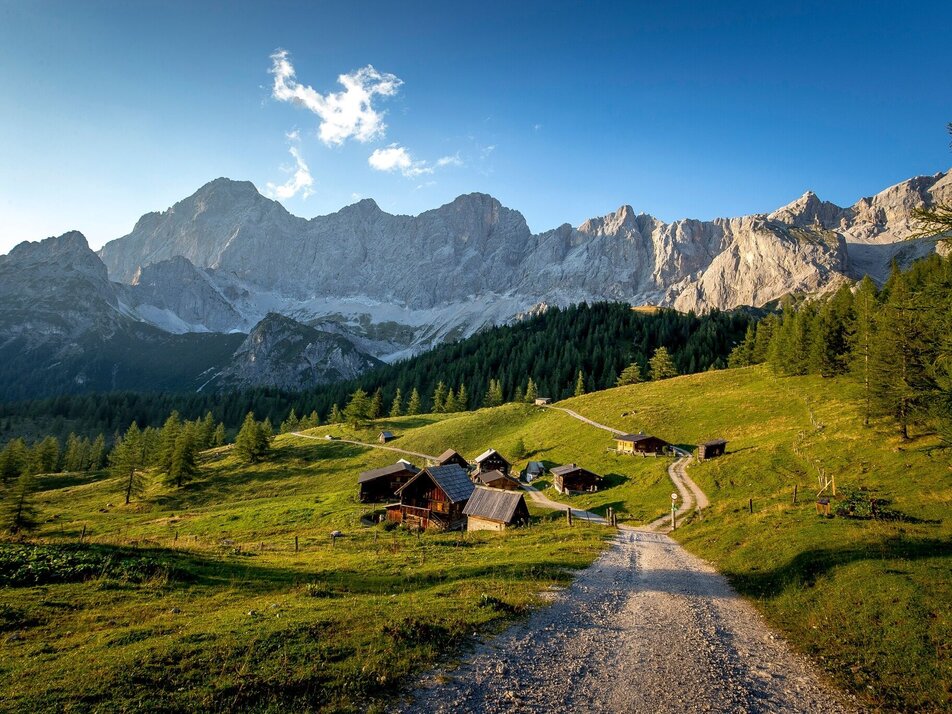 The starting point is the car park at Gasthof Dachsteinruhe. The trail starts at the county border between Filzmoos and Ramsau. You can either walk up the forestry road or take the shuttle to see the marmots at Schaidalm below the Bachlaalmhütte. You will soon discover marmot holes in the field. To see the marmots, you will need to be patient and it will be easier if you take some carrots, apples or nuts with you. From Schaidalm, follow trail no. 671 east, towards Marboden. This easy trail offers impressive views of the steep slopes of the Dachstein. The trail crosses a little brook and will lead through larch woods to Marboden and Neustattalm. Past Neustattalm, you will reach the Dachsteinstraße. Follow the street down to Glös-Alm. From there, take the forestry trail through a short forest passage to the Luxwiese. There, you will get to the Duregg Loop Trail no. 8. Take a final look at the three impressive mountains Torstein-Mitterspitz-Dachstein, and follow the narrow alpine path back down to the Dachsteinruhe.