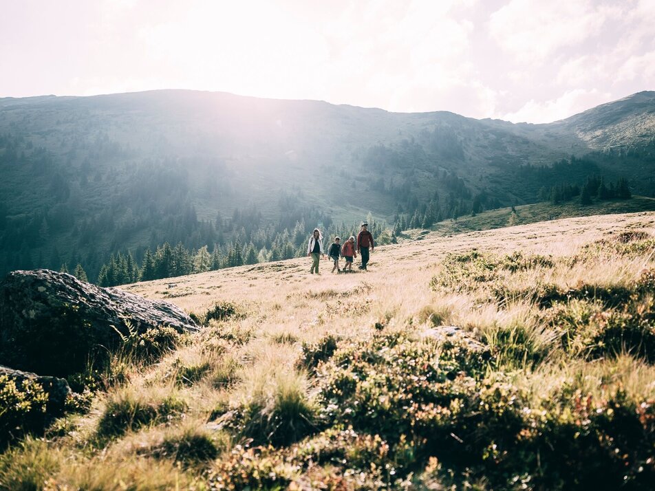 To the left of the alpine pasture, after the plain, a path goes uphill in the direction of Schoberspitze (1 hr.).