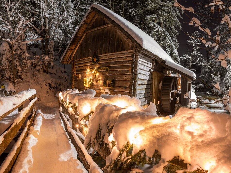 The starting point is the restored Old Mill in Rössing. From there, the route takes you along the Hofrat-Gruber-Weg, stylishly decorated and illuminated for Christmas, and the idyllic Philosophenweg, past the sites where 9 of a total of 64 Ramsau water mills once stood, to the Waldschenke in Ramsau Ort.