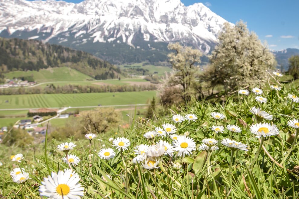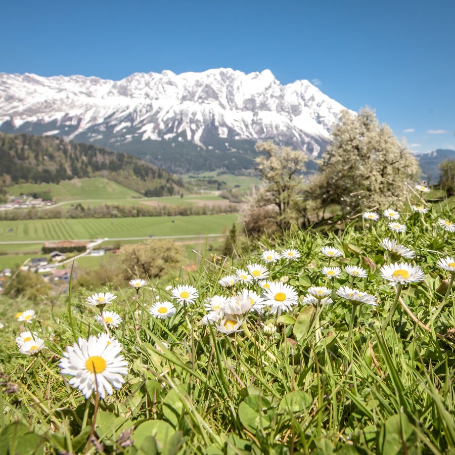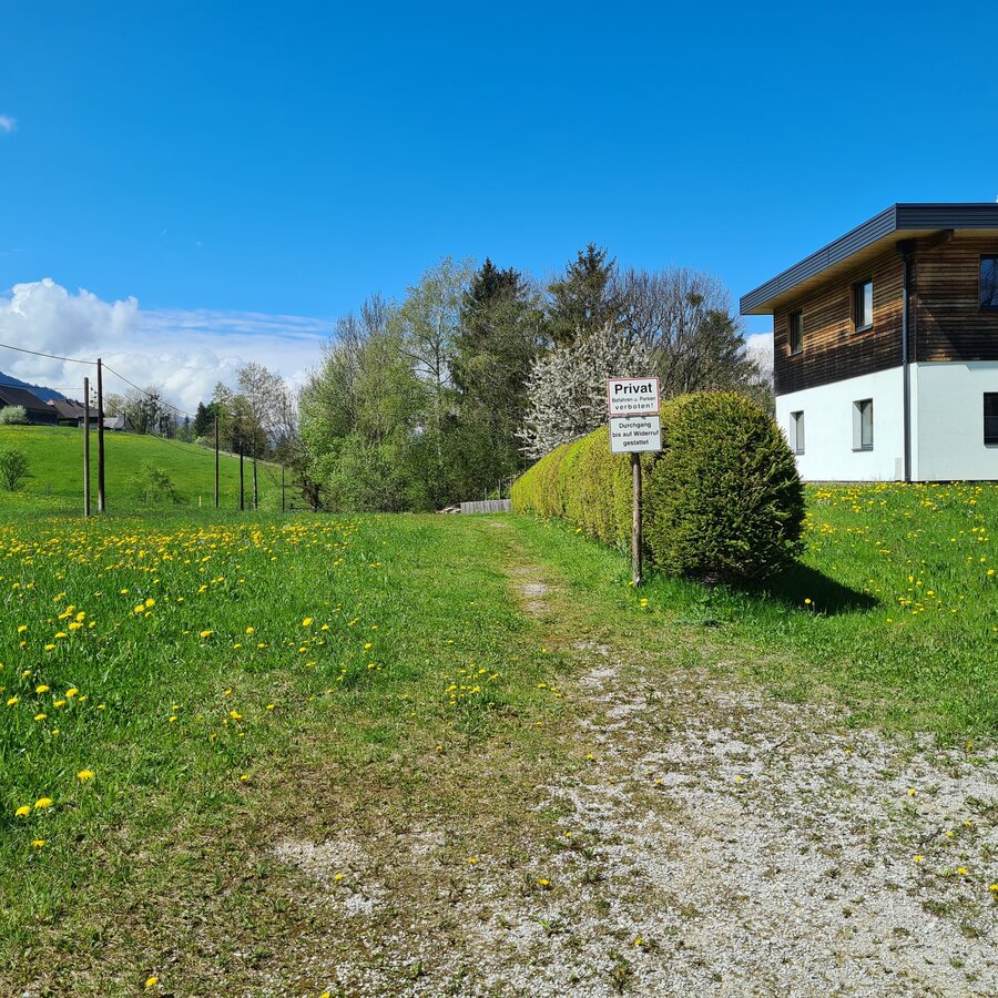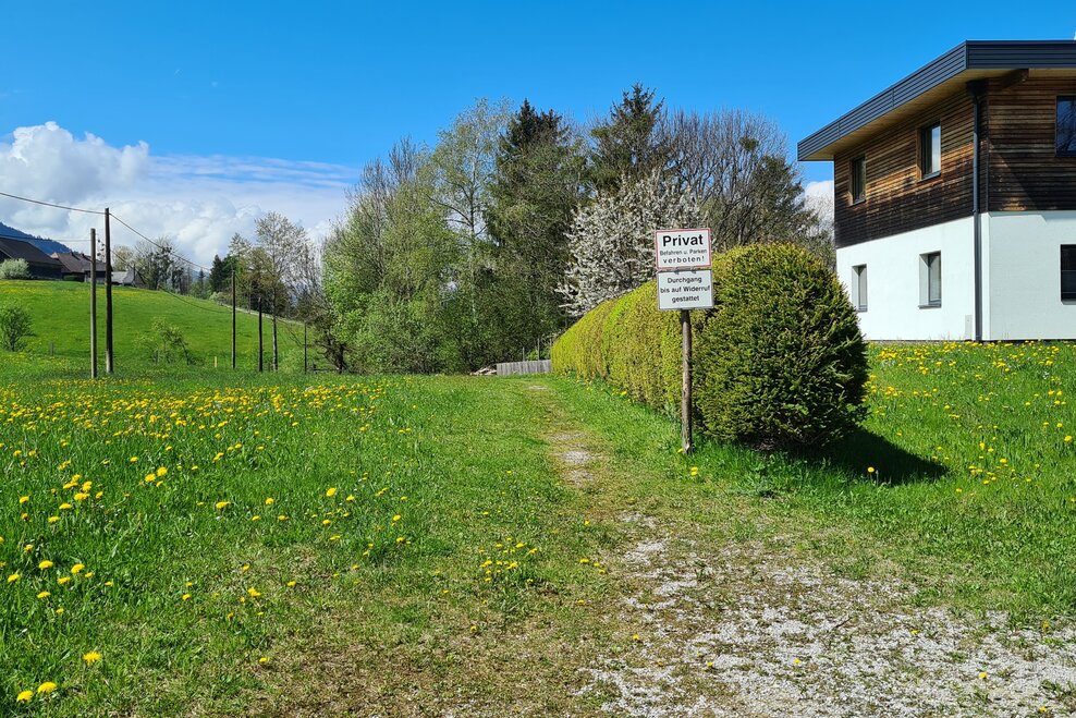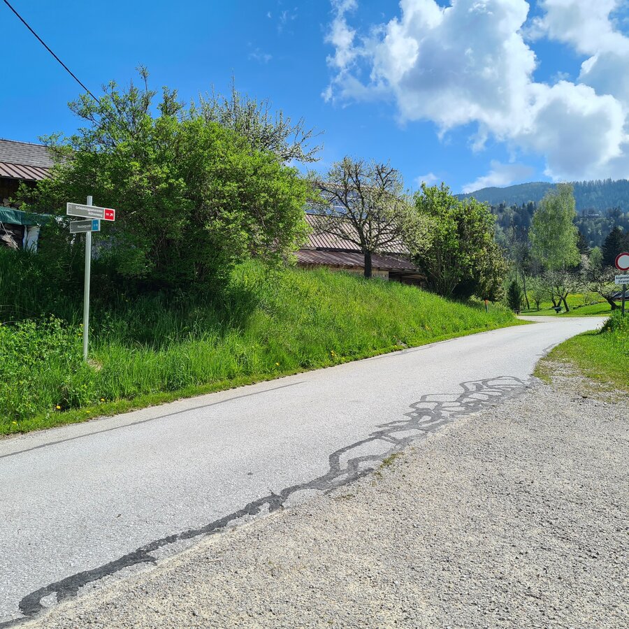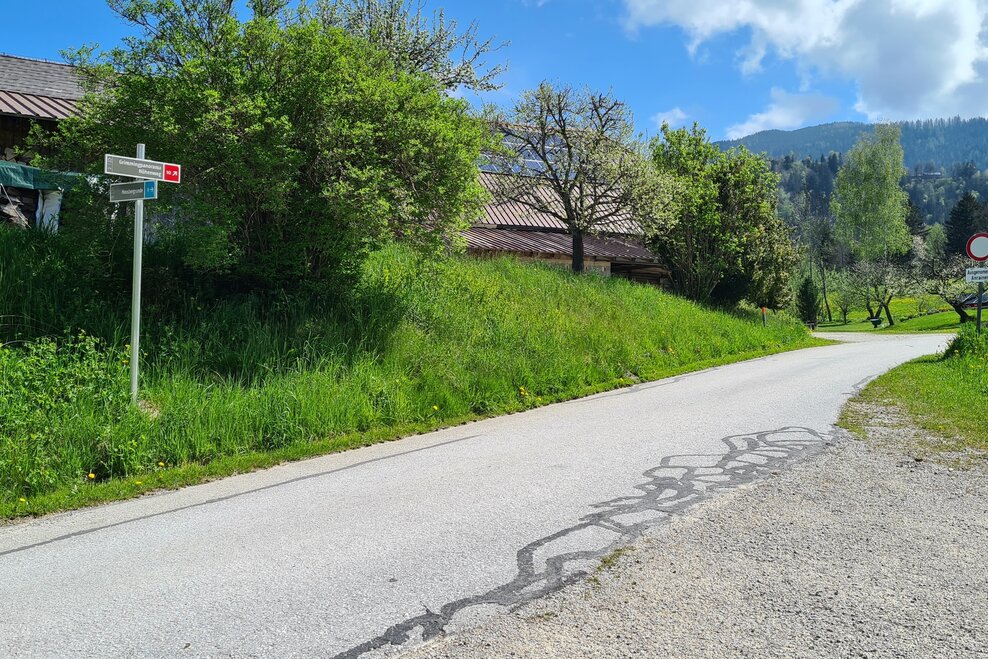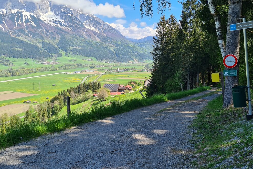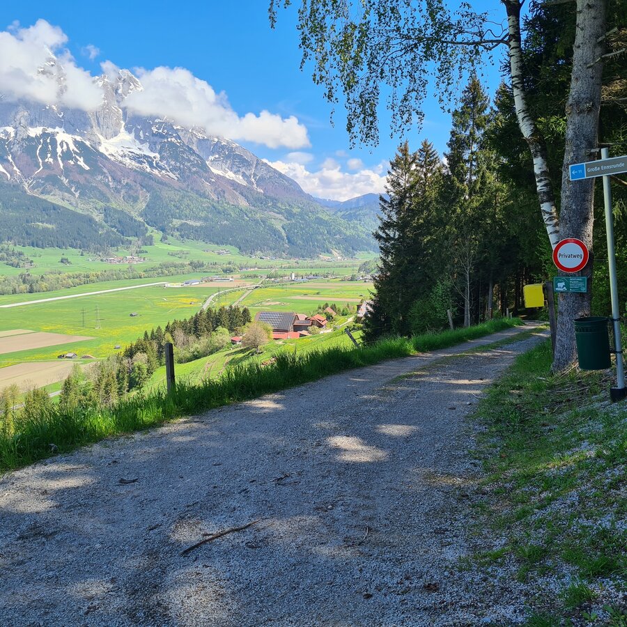 From the Gasthof Grimmingtor follow the road into the valley to the Moosberg junction at the Moosbergbrücke. You walk along the Moosberg supply road over a few serpentines to the Grimminger Panorama Höhenweg (GPHW) junction at vlg. Moosmoar. Here you turn right and walk past a single house above the "Schulgraben" rift to the driveway from the Webersberger farm. Here you follow the Moosbergstraße uphill to the Gatschberger farm and then steadily downhill in the direction of Sonnberg. After a bit through the forest, you turn right onto the private path to Murberger farm. Continue downhill past the farm and then down the access road from Murberger to the old Niederöblarn state road. Past the Ripplmaier farm you walk back into town to the parking lot at the Gasthof Grimmingtor.
