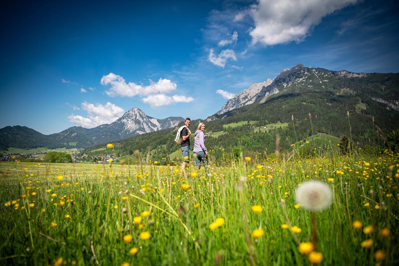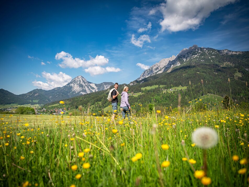 Starting point "Hotel Reisslerhof" - The small "GENUSSRUNDE" enchants with beautiful meadows and forest paths with a wonderful view of Gröbming, Stoderzinken and the Schladminger Tauern.