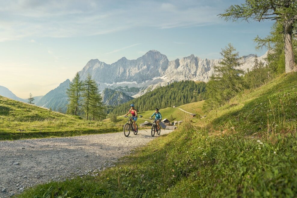 The tour begins at the Planai Stadium in Schladming and takes you through the Untere Klaus district and Birnberg to Ramsau. From there, the route continues past Gasthof Edelbrunn to Brandalm and finally to Türlwandhütte at an altitude of 1,750 meters – a perfect spot to rest with stunning views of the Dachstein.
