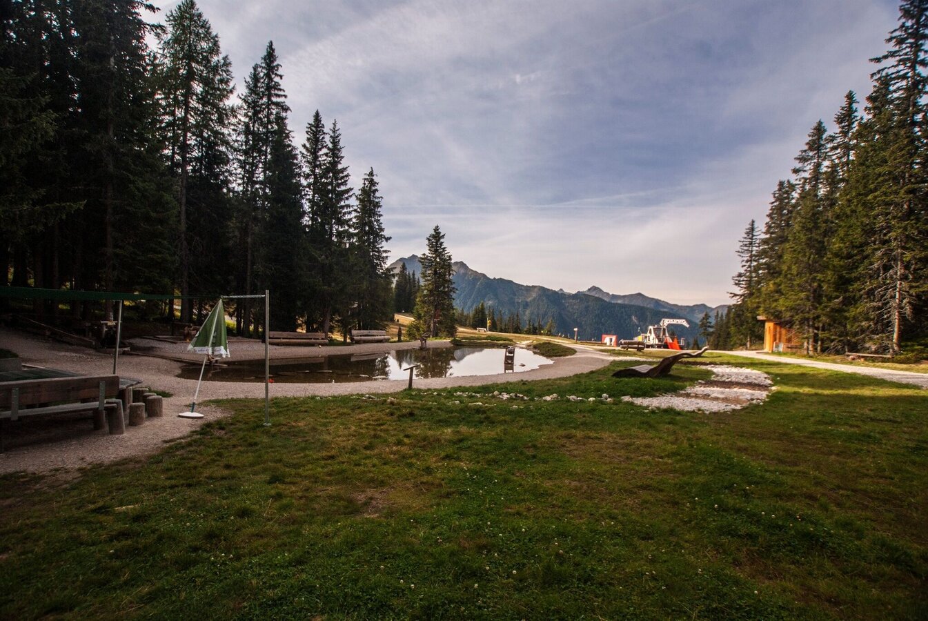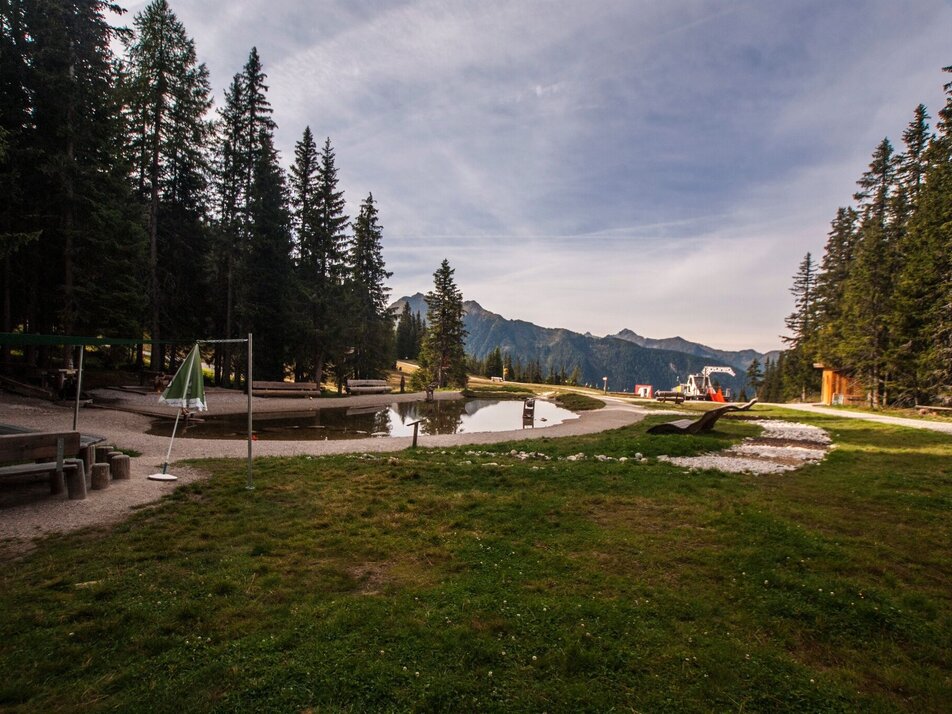 From the middle station, continue uphill along the World Cup trail. To do this, cross the FIS downhill run slightly to the south-west up into the forest. In the forest, the trail climbs below the Lärchkogel cable car to the next forest path. Pass below a high seat and head back through the forest to the FIS downhill run and over to the Bruckmoos reservoir. Continue along the WM trail, past the Quellbodenhütte and through the forest and up the FIS downhill run. Before a steep section, the trail branches off to the right into the forest and leads you over a few short hairpin bends to the mountain rescue hut at Hopsiland Planai. From here, it's only a short walk up to the Schafalm and the Planai cable car mountain station.