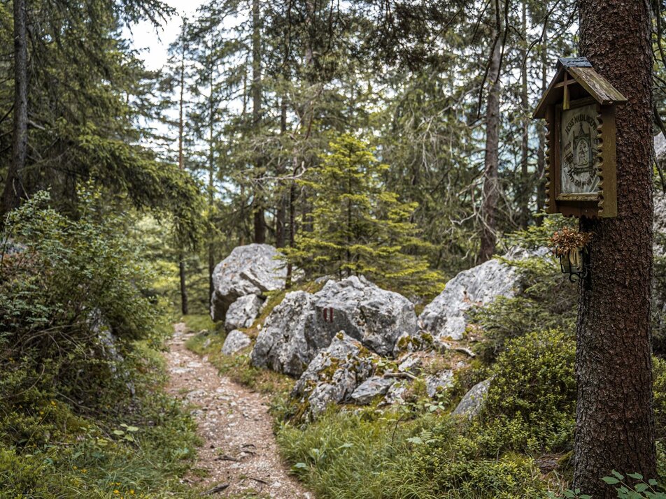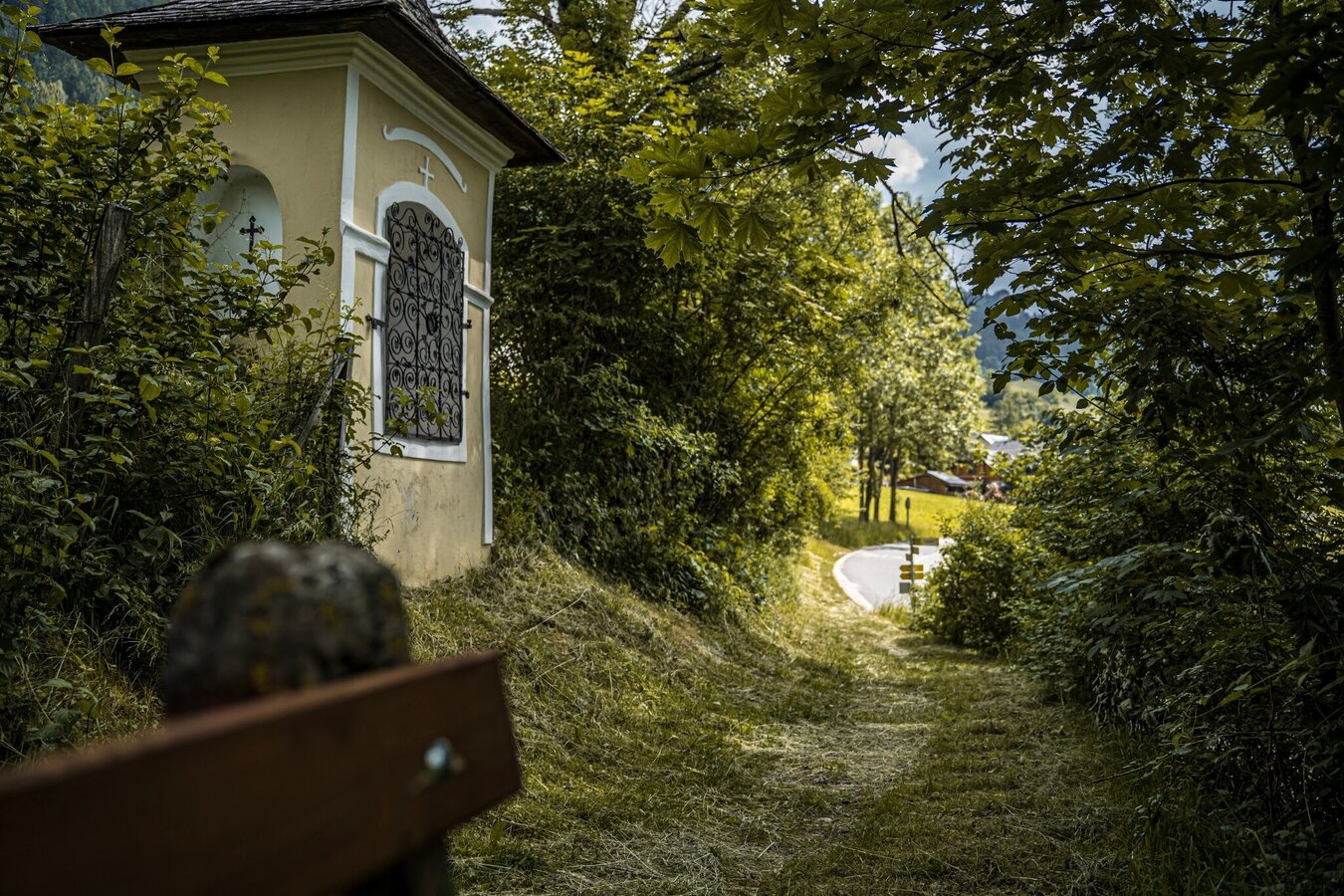 First you follow the directions for the Dachsteinblick circuit above to the crossroads with path #10. However, you continue hiking towards Pürgg and shortly afterwards you come to a second crossroads. At this point you turn left and hike slightly uphill to the connection to path #289 in the bend near Wischberger-Lehen. Here now the road back - past the natural swimming pool - to Pürgg with the beautiful parish church of St. Georg and the associated rectory as well as the Johannes chapel. We head back west out of town. After just a few meters the Marterlweg branches off to the right again. You follow this again to the crossroads with path #10, which you now follow back to Lessern.