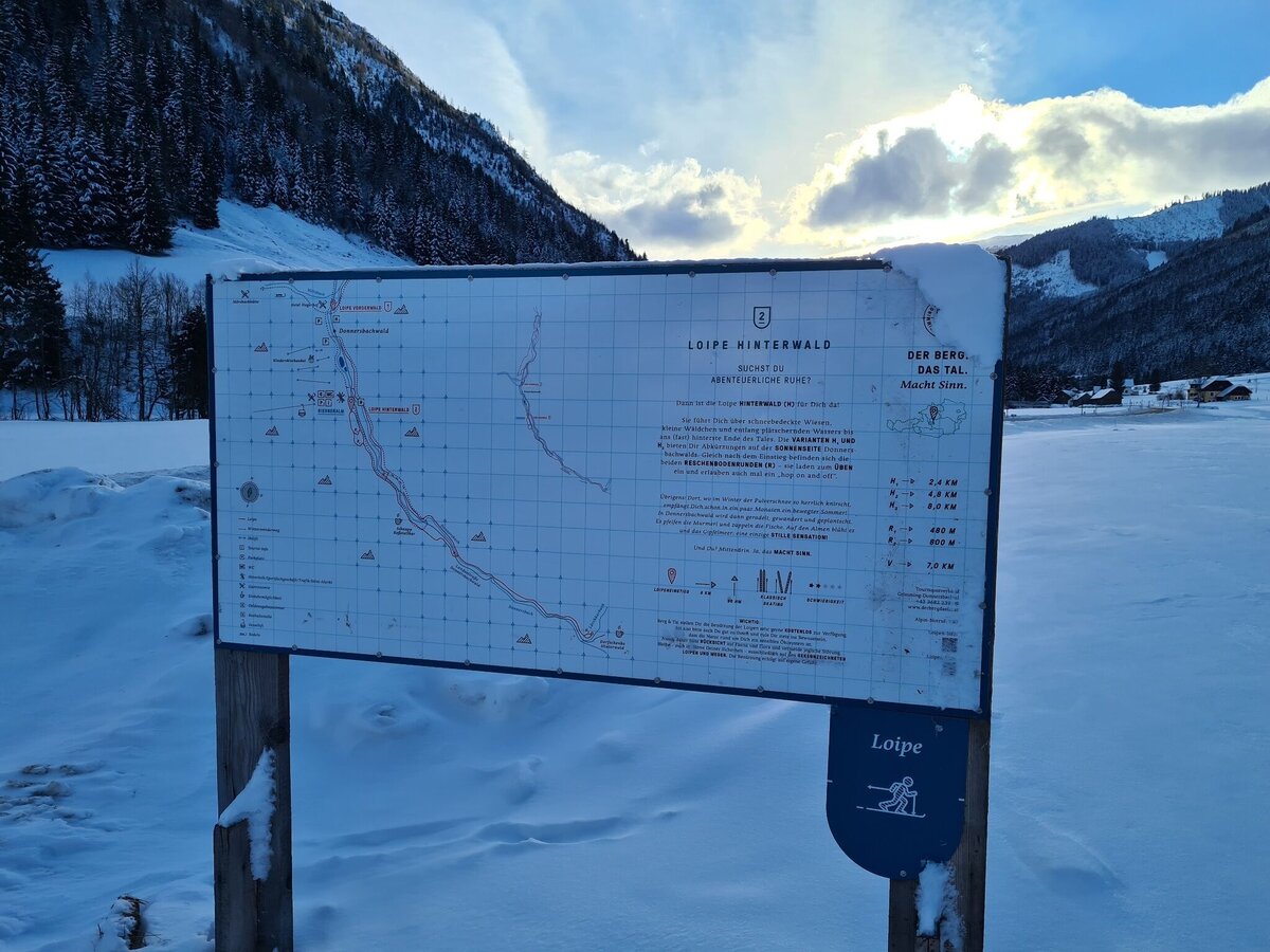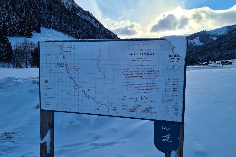 At the southern end of the Riesneralm car park you start at the overview board for the practice trail and the Hinterwald trail. From here the longer loop stretches to the end of Reschenboden while the shorter one branches off in the middle and leads back to the starting point.