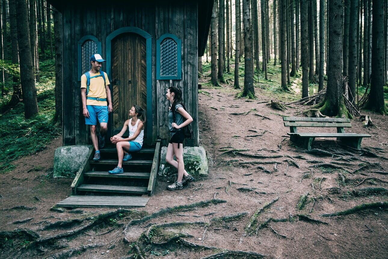 About 100 m further on, turn right and follow a small forest path slightly downhill until you reach the Heiligenbrunn with the chapel next to it. The water is said to have healing properties, so it is worthwhile to drink enough here and especially to wash your eyes! Follow the path downhill to the road, cross it and continue to the Enns. Then keep to the right and walk along the river to the gravel path. Turn left and cross the small bridge. Walk along the meadow until you reach the main road, which you cross again. Now follow the signs and hike back to the starting point.