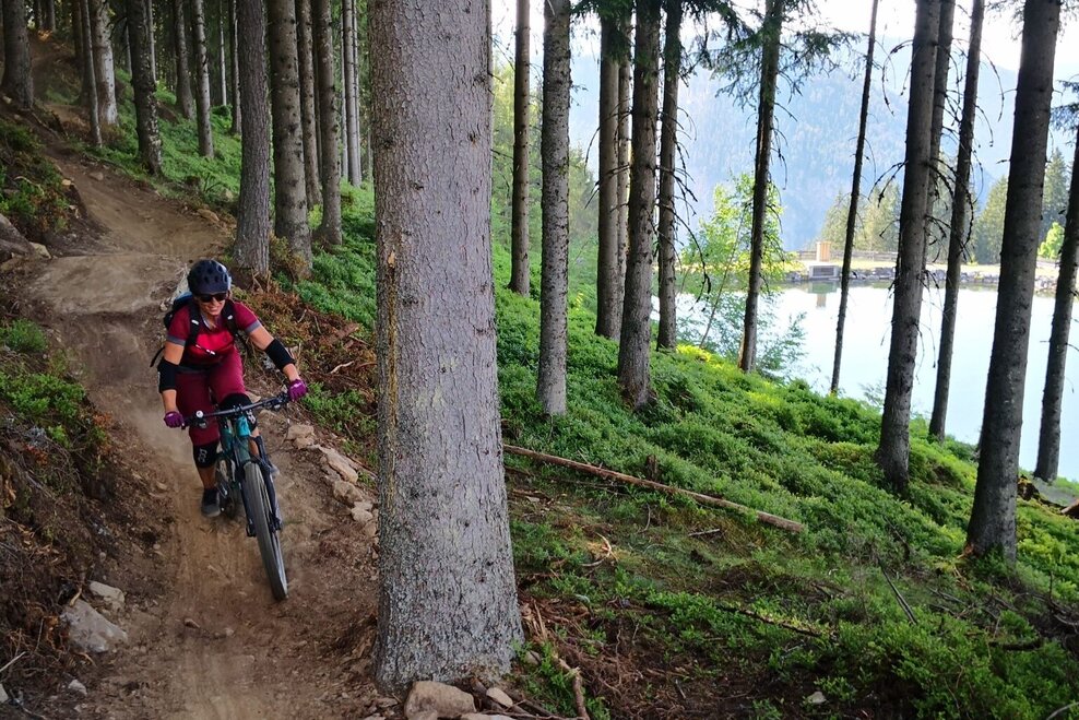 After approx. 500m on the Schnepfenwald Trail, Route 66 branches off directly to the left and leads along an old hiking trail to a forest path, on which you have to cycle uphill for a short distance, then Route 66 branches off to the left into a fast, varied second section. The trail ends directly at the Schnepfenalm. After a short stretch on the road, you reach the final section of the Schnepfenwald Trail, which leads directly to the Preunegg Jet valley station.