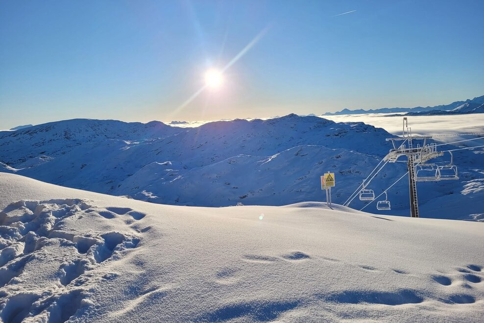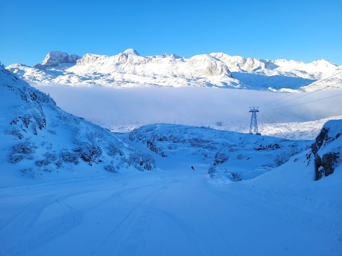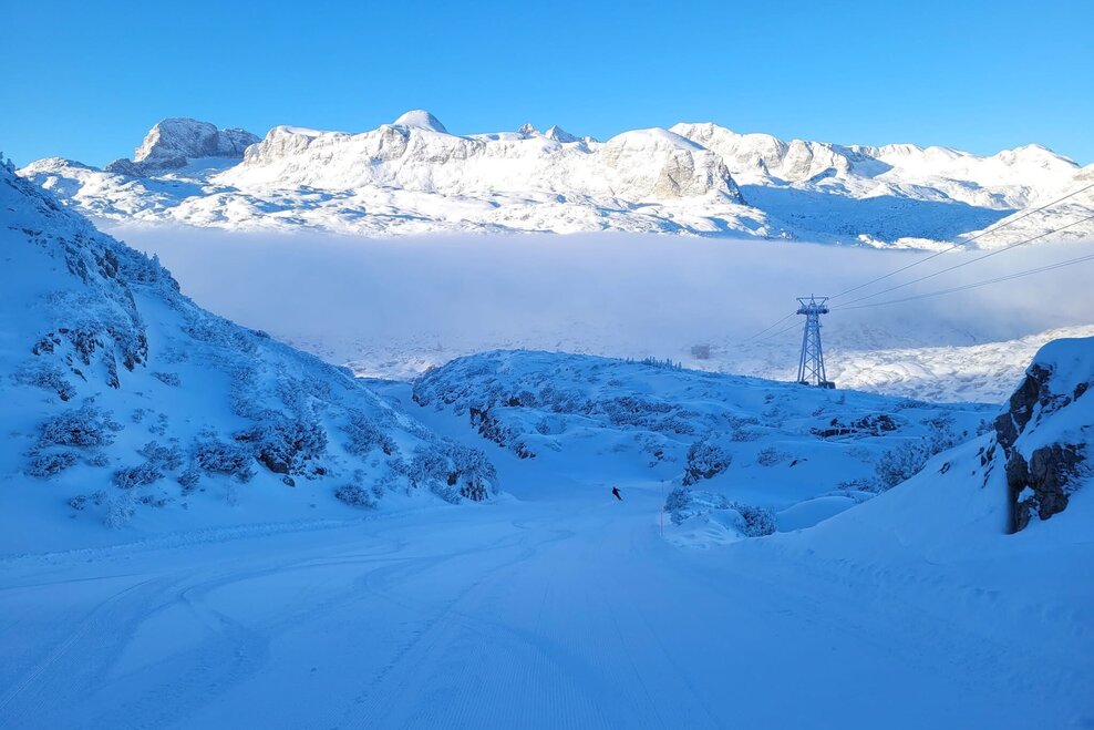 The ascent begins here. Pass the valley station of the Krippenstein gondola (section 3) on the Oberfeld and follow the pole markings in a south-easterly direction. On the right are the Niedere and Hohe Rumpler and the Moderstein. The route turns south through hilly terrain towards the Schladming Glacier past the Niedere Gjaidstein to the former valley station of the Mitterstein chairlift (disused). From here, stay on the groomed trail across the glacier back to the starting point at the mountain station.