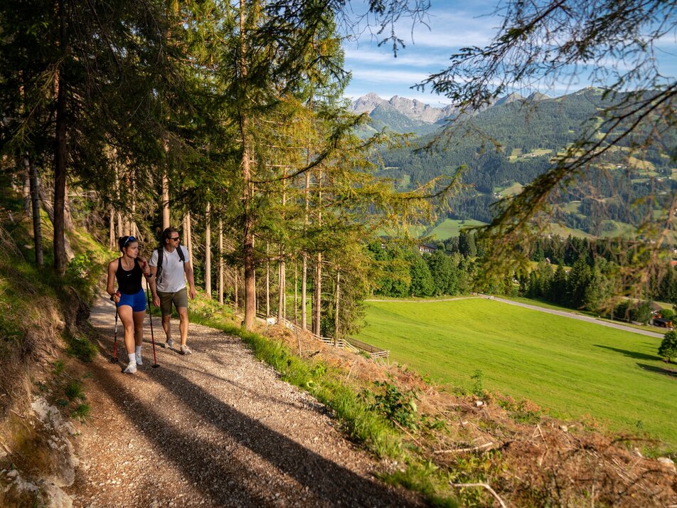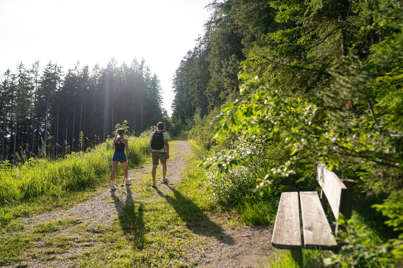 Follow the wide path to the next crossing after approx. 20 min. Take a right (careful: it's easily overlooked), into a narrow forest path with a steady incline to the Sattelberghütte. Past the hut, you will take a wider path through the forest to Hotel Edelweiß. From there, the street will take you to Hotel Almfrieden. Join the walking trail to Kulm.