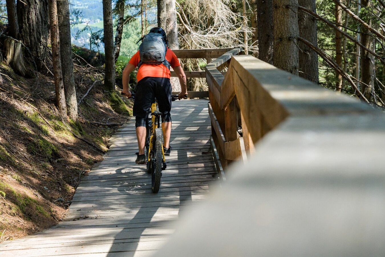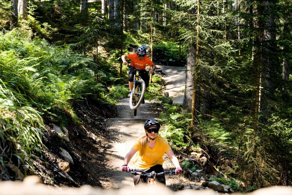 The route of the first section of the trail is very playful and has a great fun factor for all skill levels. Thanks to its very flowy and easy route, it is particularly suitable for beginners. The second section begins after a short ride on the Reiteralmstraße and impresses with its very varied route with wooden elements, right up to the Preunegg Jet valley station.