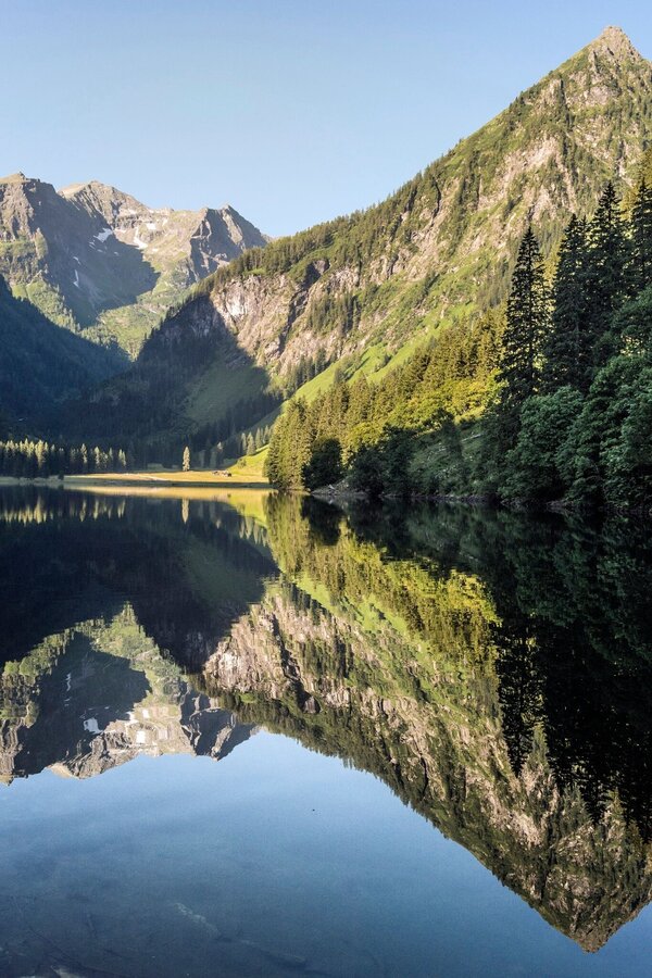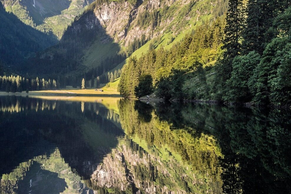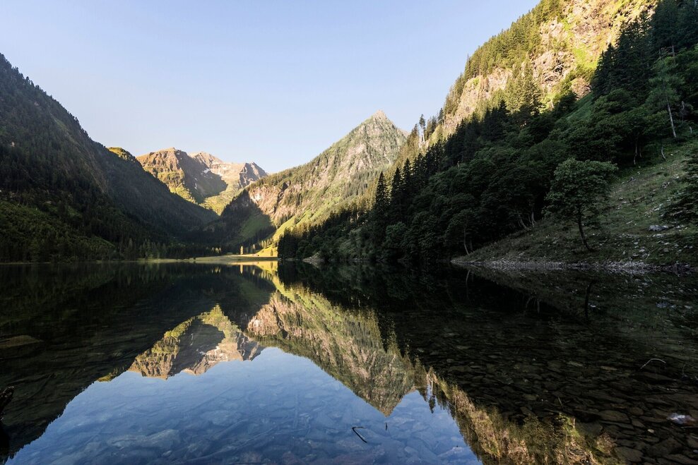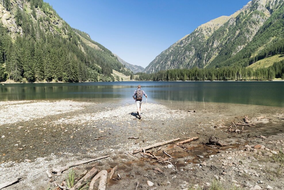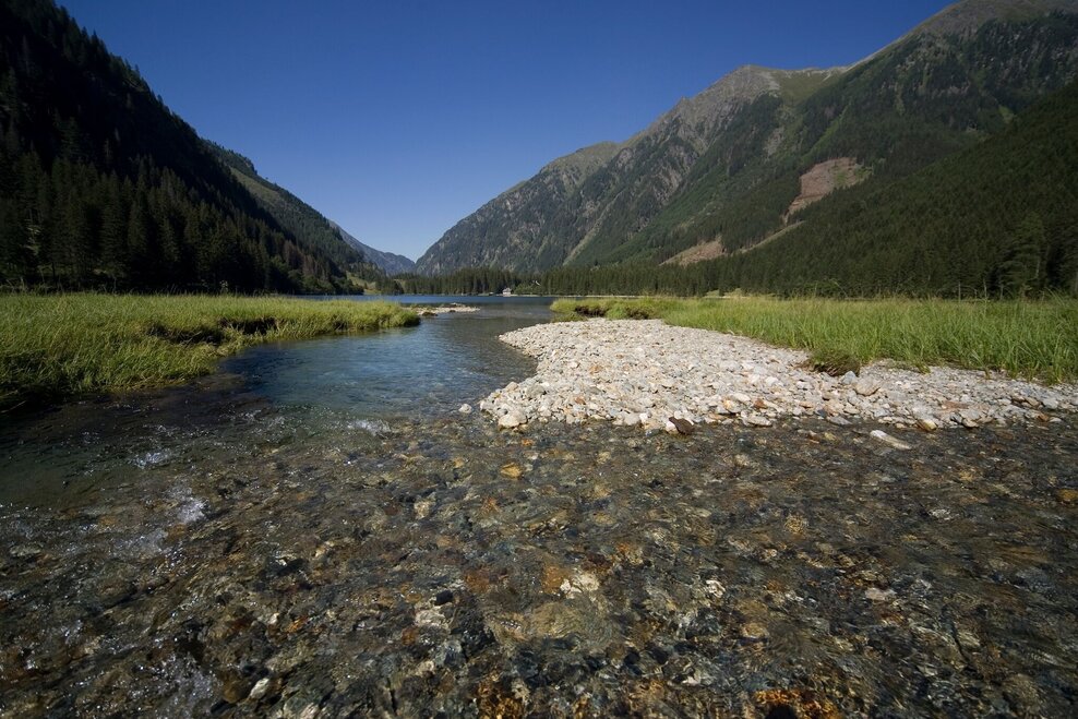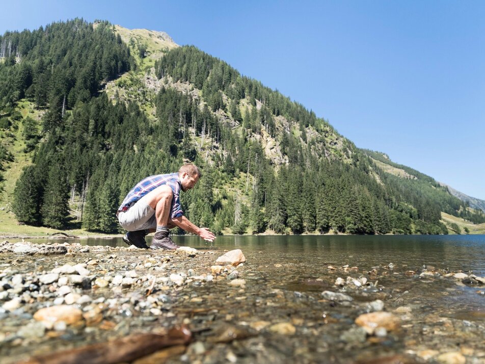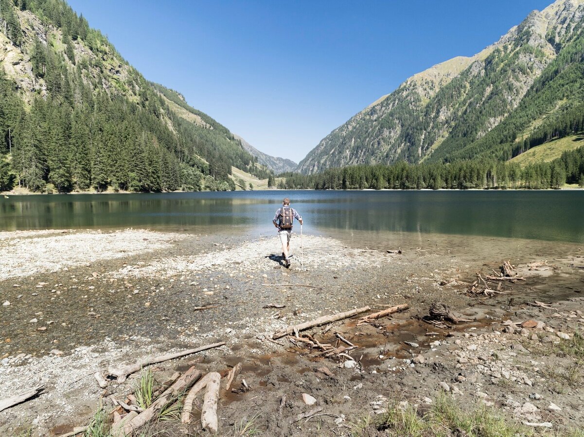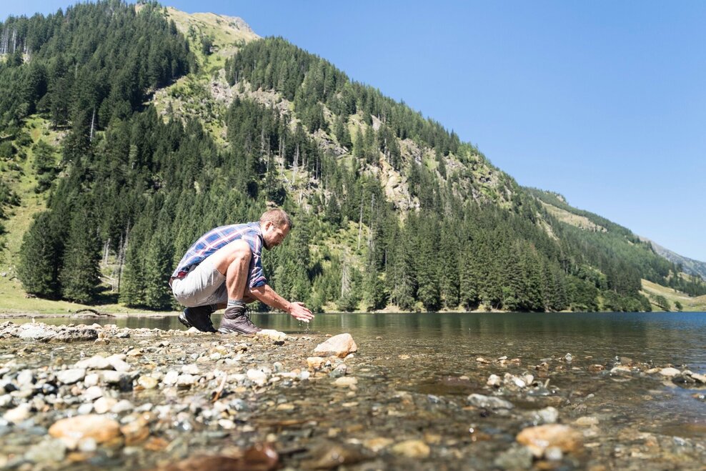 The further we drive into the Kleinsölktal, the more imposingly the steep forested hillsides ascend towards the peaks above. From the Breitlahn Hütte, a broad path takes us on an almost flat walk alongside the Kleinsölk stream to the Schwarzensee. Three sides of this lake are surrounded by dark forest, standing along the shore are a number of enormous, ancient alpine maples. And in good weather, whenever we come to a clearing, we can enjoy enchanting reflections off the lake.