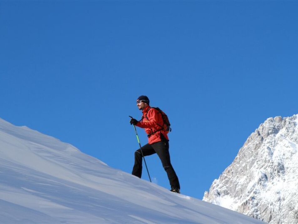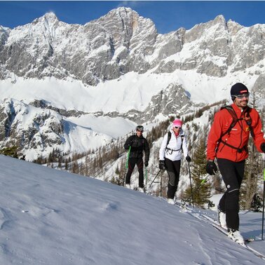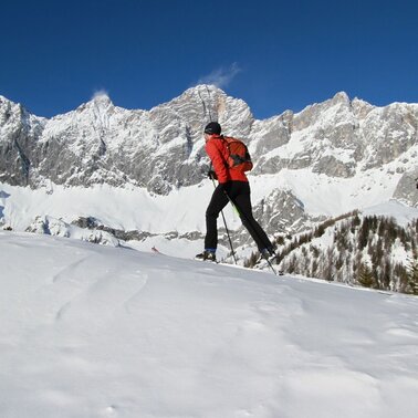 Ascent: beautiful ski tour at the foot of the Dachstein Südwände. The ski tour starts from Gasthof Dachsteinruhe and leads towards Bachlalm. At the Schaidalm, the ski tour goes through the larch forest towards Sulzenhals. Follow the path to the right and start your ascent of the Tor.