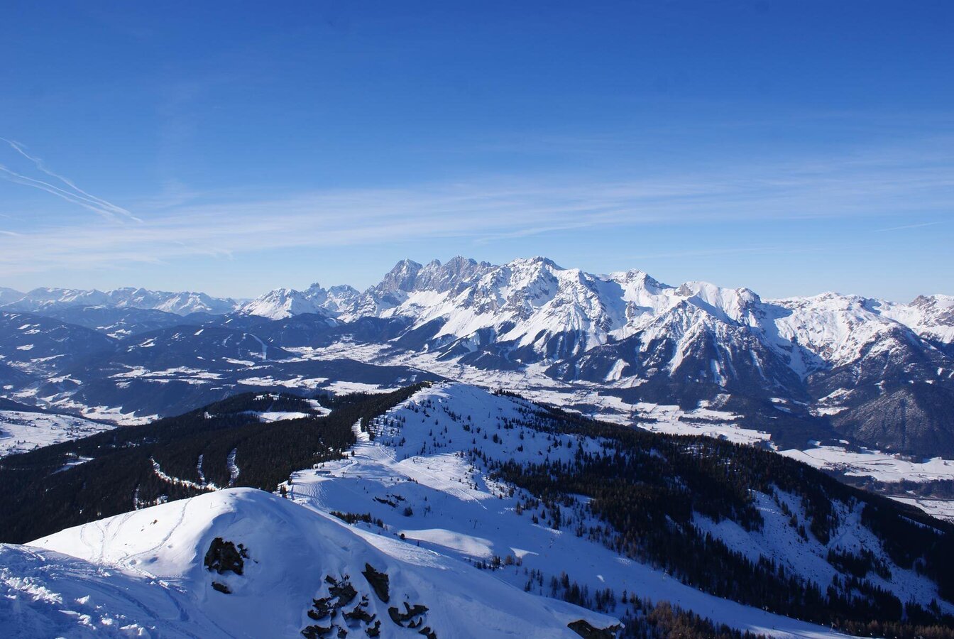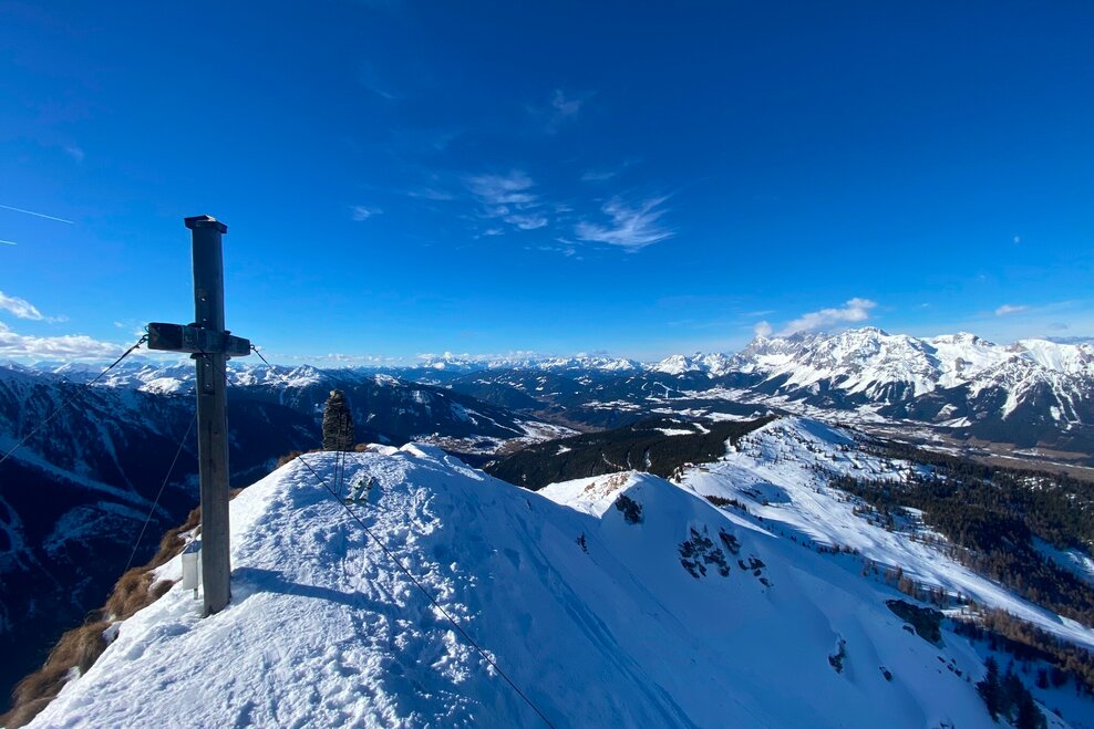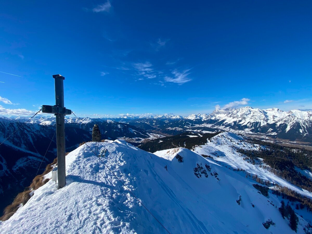 This short skitour to Krahbergzinken starts near the top of Mitterhaus chairlift. The starting point can be reached via Planai cable-car, Märchenwiesen chairlift and Mitterhaus chairlift on marked terrain. At Krahbergsattel, south of the top of Mitterhaus chairlift, you leave marked terrain and head into the sparse wood at the timberline, which you soon leave behind. You ascend along the Northwest face, which gets a bit steeper towards the end. Shortly before arriving on the summit you unstrap your skis to reach the summit on foot. The East face is falling off steep here - be very careful!
