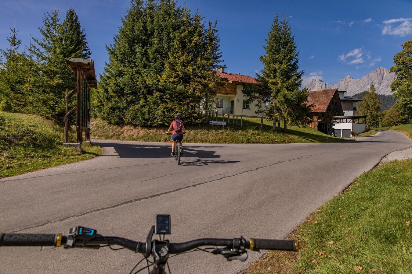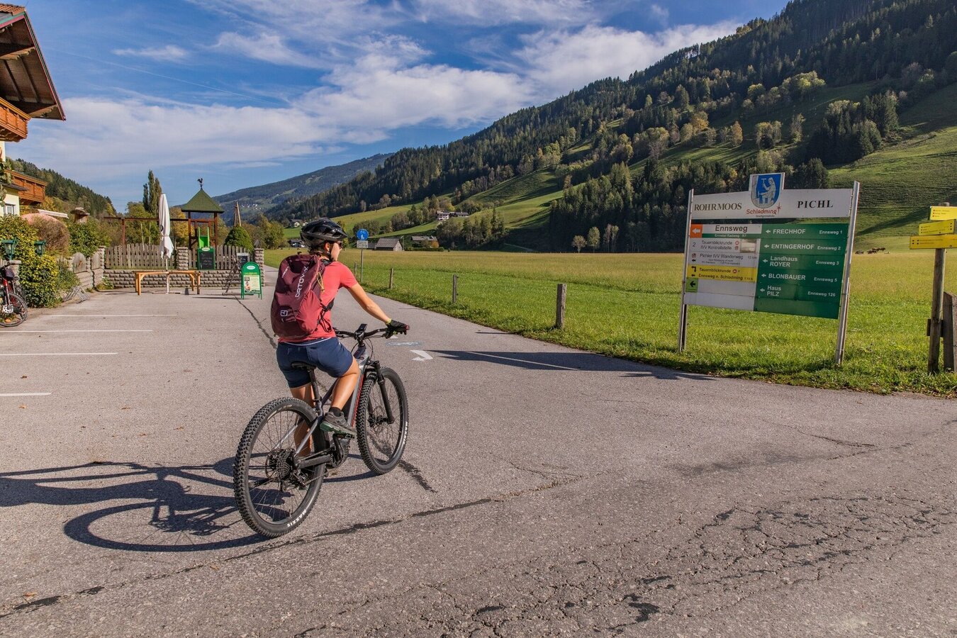 Starting point Planet Planai – Zirngast – Oberndorf – Birnberg – Timmelbauer – Strimitzweg – Untere Leiten – Weiglhof – Torf – Biobauernhof Brandlhof – Stockerwirt – Fichtenheim – Kreuzung Pichl-Vorberg – Pichl Vorberg – Steirerhof – Pichl – Ennsradweg – Café Hermann – Maistatt – Schladming – back to the starting point
