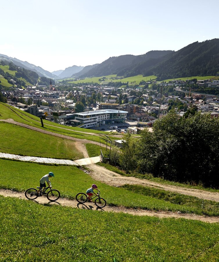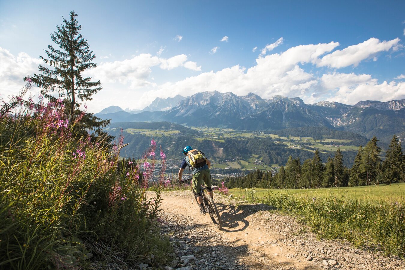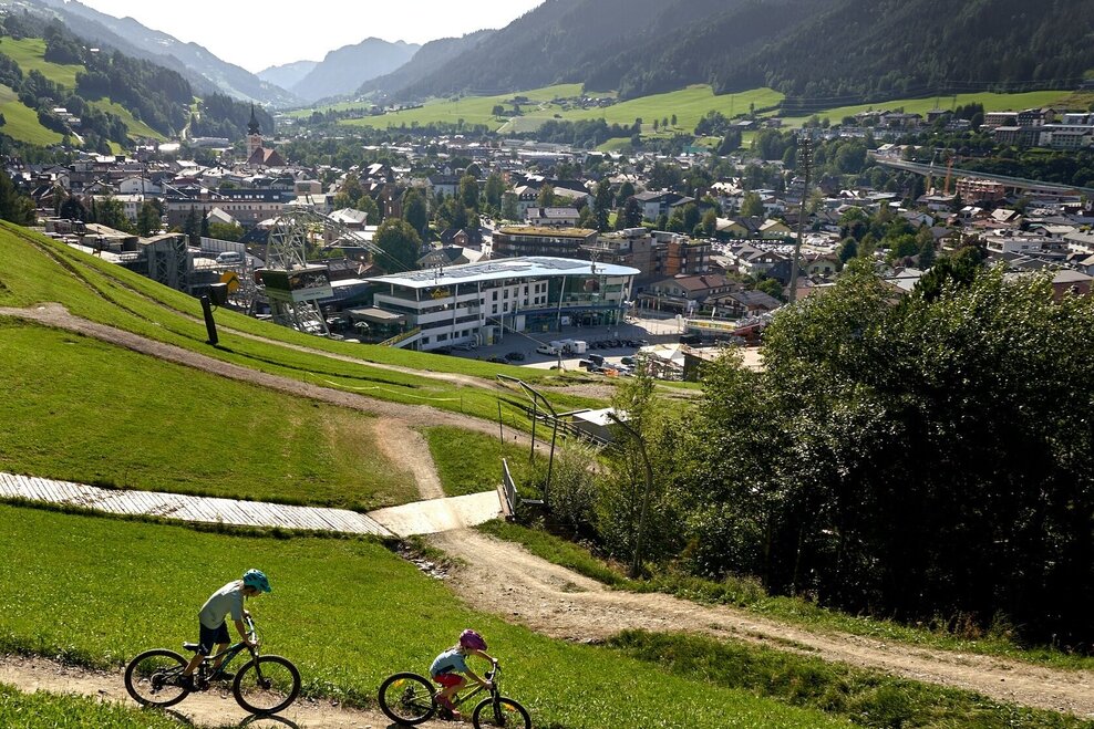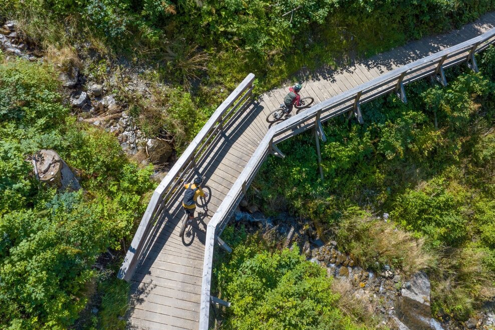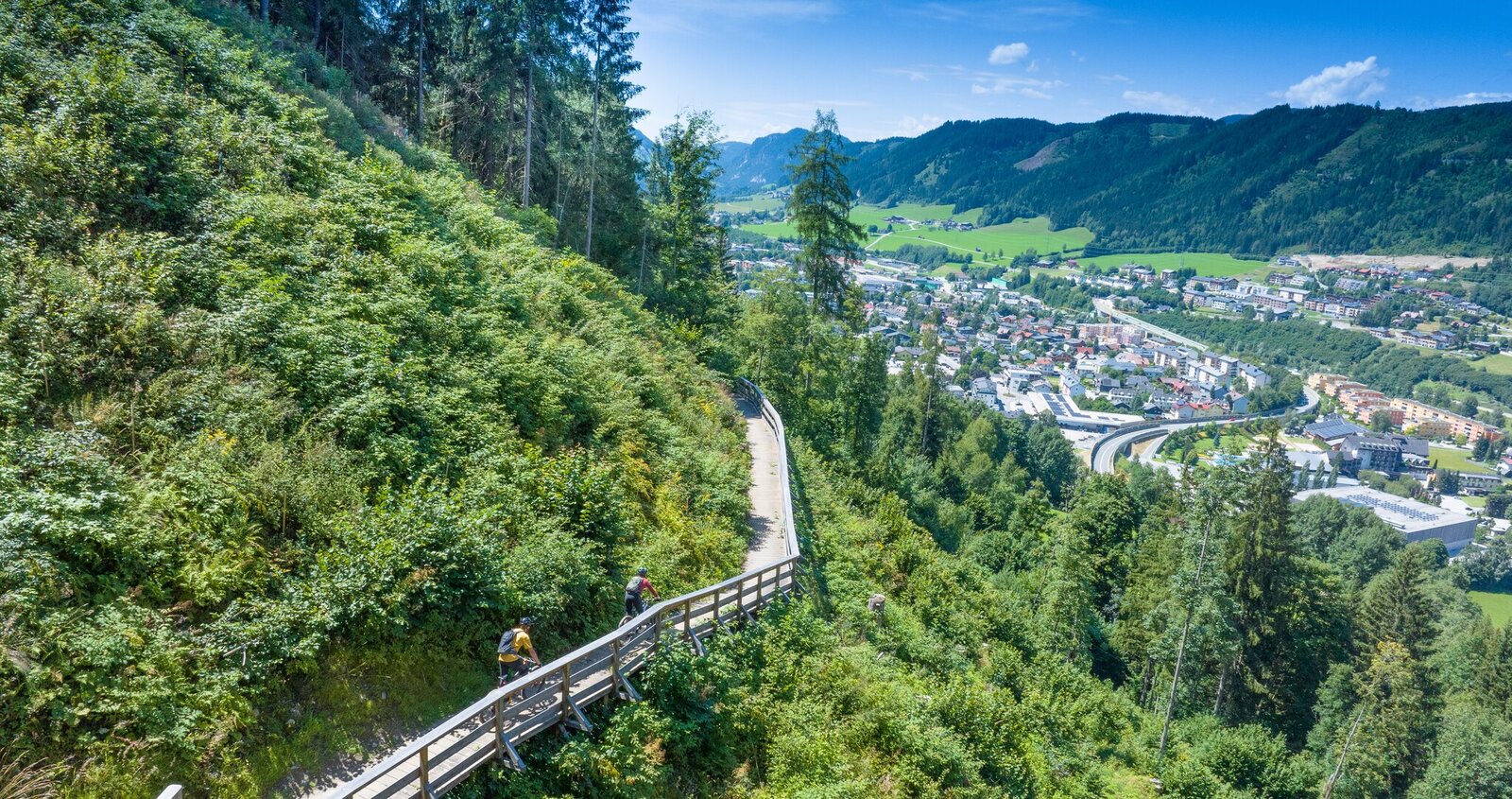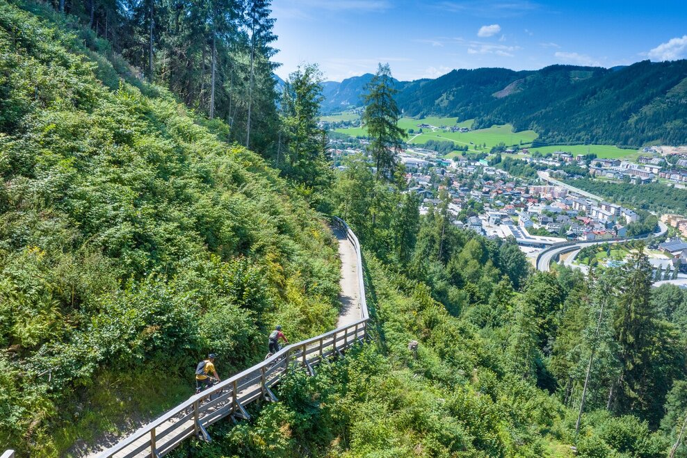 Die Stadium Flowline ist schon etwas anspruchsvoller als die Peak Flowline im oberen Teil.Der Trail wird schon etwas schmaler und auch die Kurven sind schon enger. Ein echtes Highlight ist die lange Holzbrücke mit freiem Blick auf die WM Stadt Schladming.