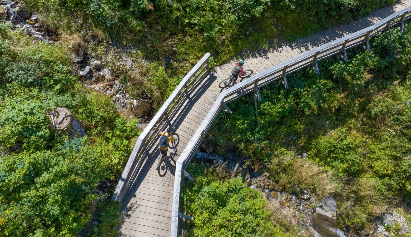Der Mittelteil der Strecke muss derzeit noch über die Landesstraße gefahren werden. Ein Verbindungsstück zwischen den beiden Trails ist bereits in Planung.