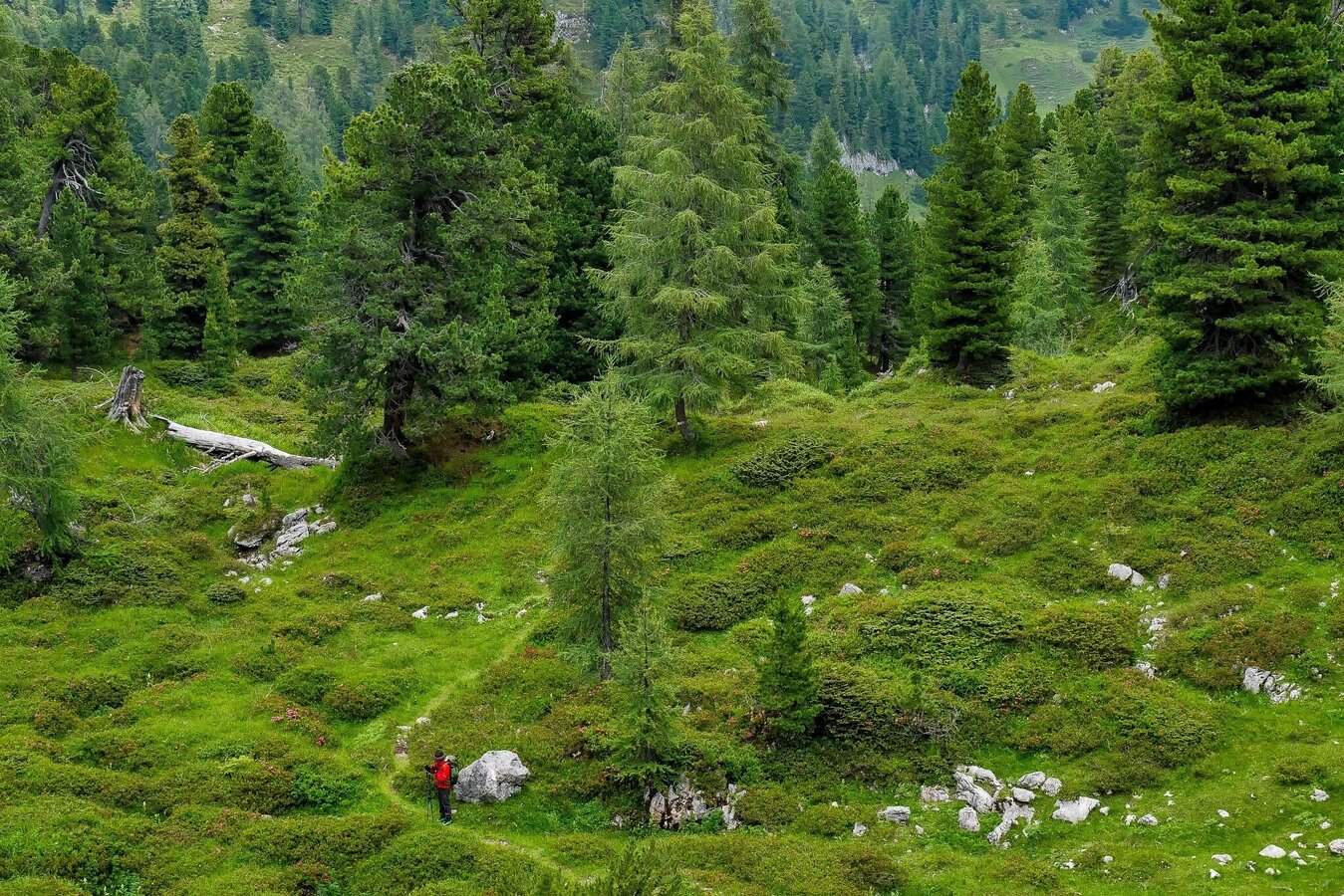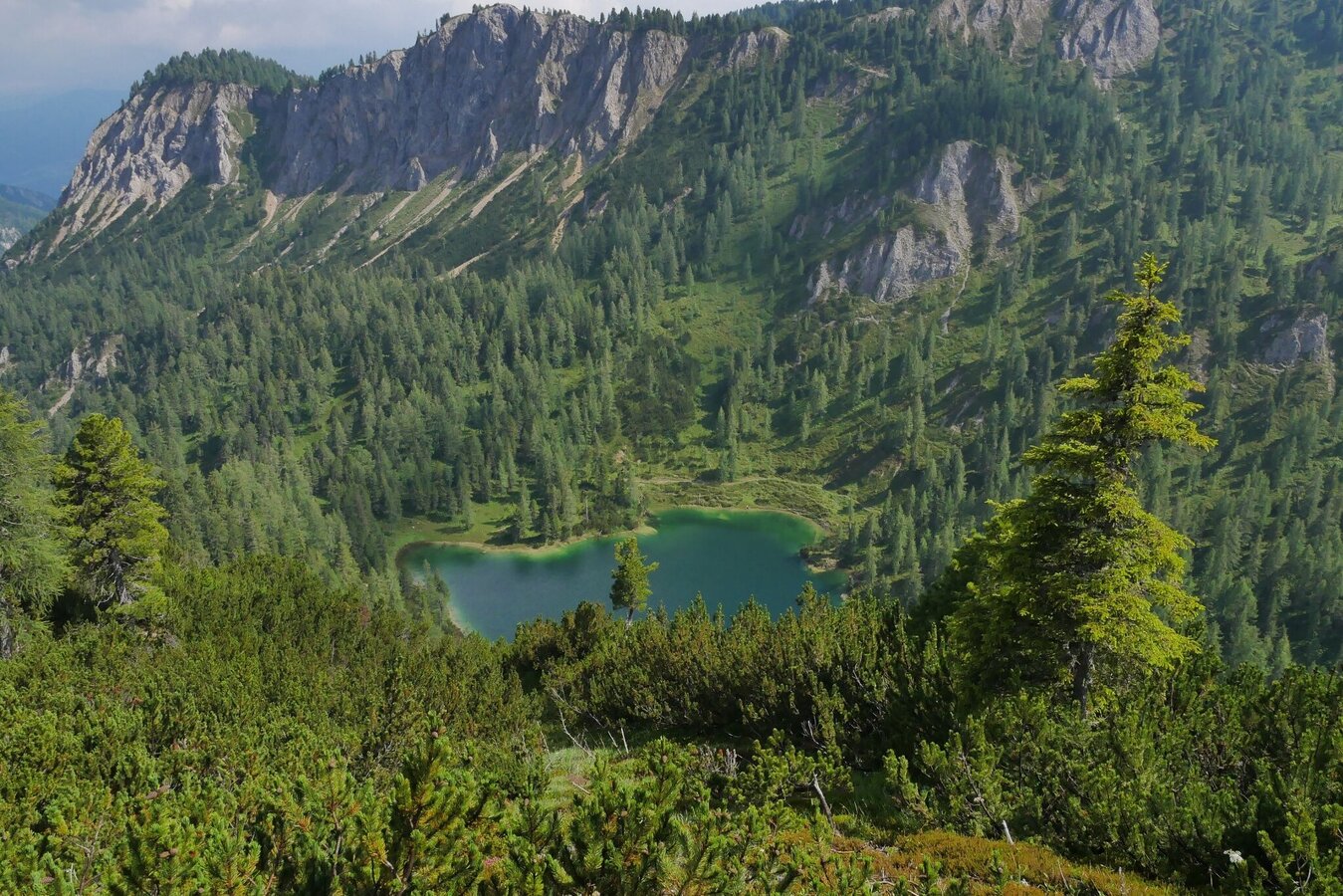 After about an hour's walk, the sight of the Höllgrabensee lake deep below provides a welcome change in this otherwise rather barren rocky landscape. In early July, the basin surrounding the lake is covered in alpine roses. The rest of the route to the Grafenbergalm is characterized by a charming landscape with rocky outcrops, mountain pines, flower meadows, gorges and small rock walls. Once you reach the Grafenbergalm, it immediately becomes clear why this place is so special. The alpine basin with its green meadows, the beautifully situated Grafenbergsee lake and groups of stone pines offers a setting that is second to none.