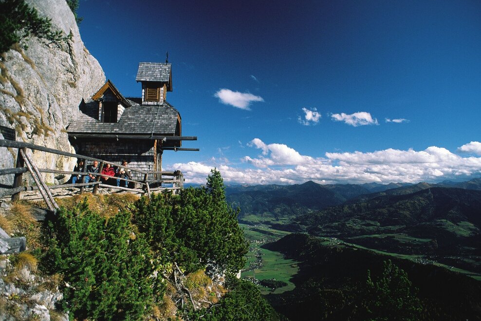 At first, you will follow the path back to the Feistererscharte, a central crossing point above the Guttenberghaus. Follow path no 618 past the northern side of the Sinabell leading through impressive, barren scenery. This seemingly endless stretch of grey rocks is only contrasted by the green of the natural pits and mountain pines. To the east, the Stoderzinken and Grimming summits cover the horizon; on the north side, you can see the endless mountain range of the Totes Gebirge (Dead Mountains).