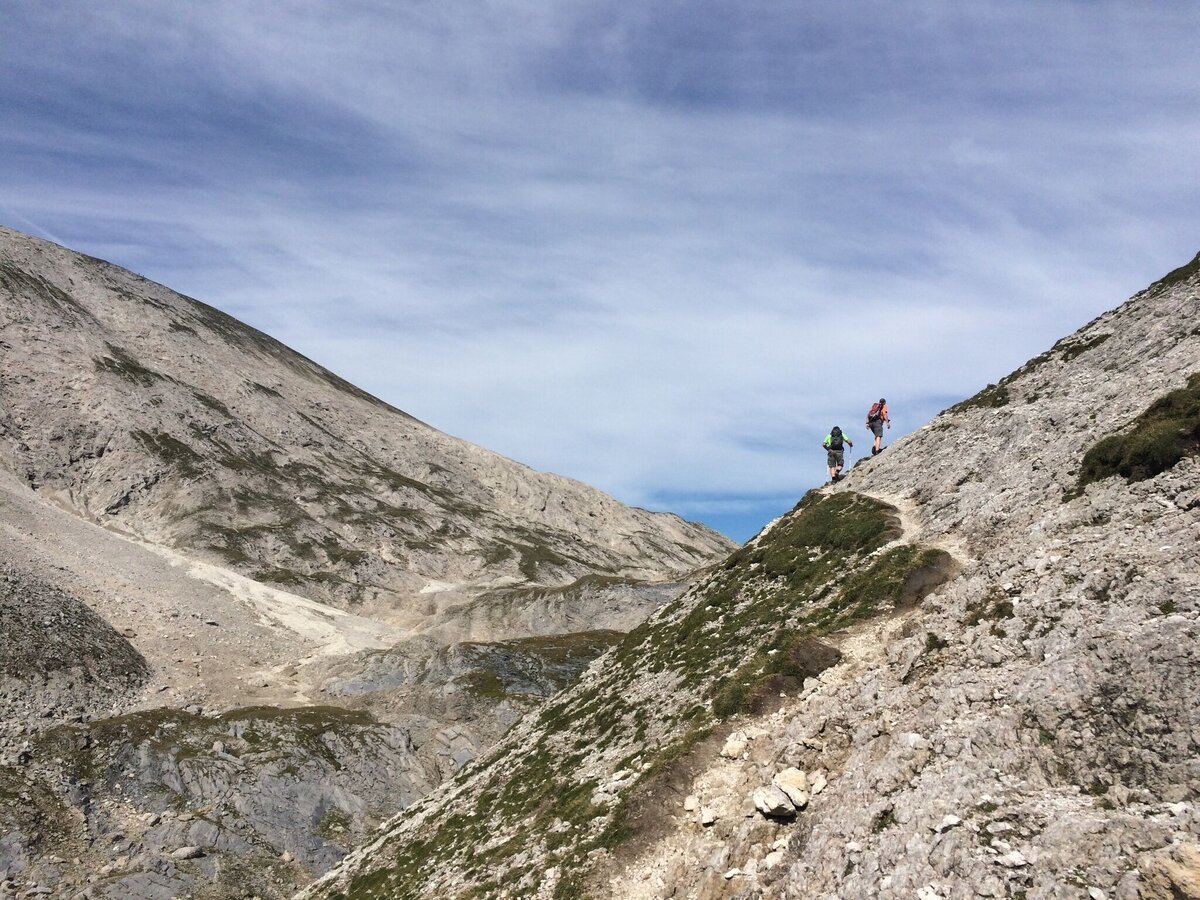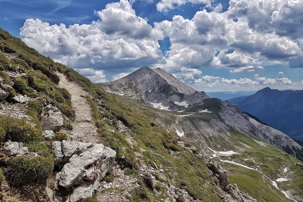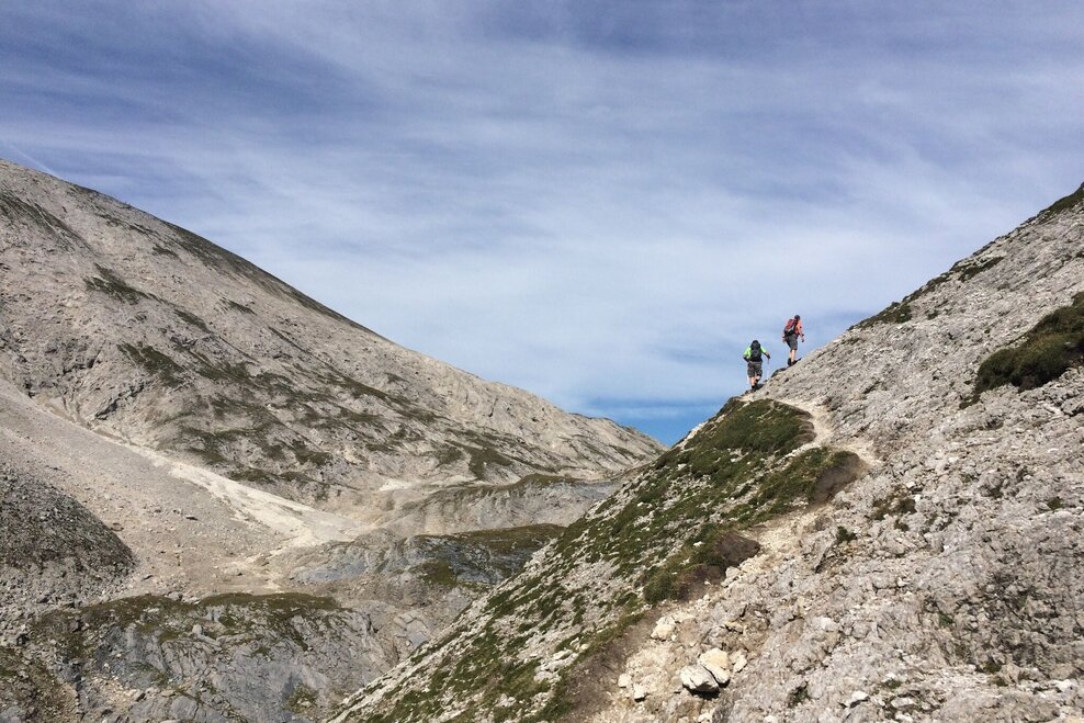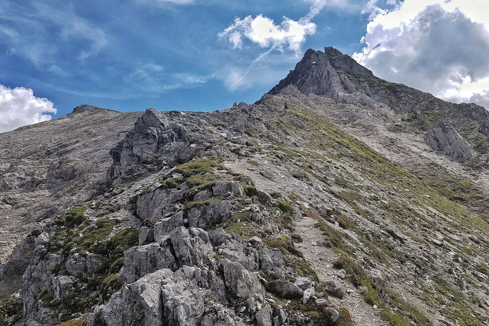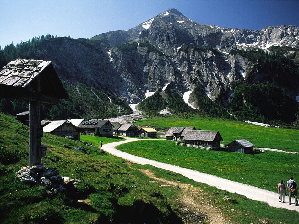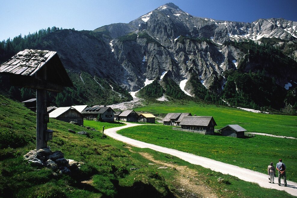 From Ursprungalm follow the Ursprungalm walk for 10 minutes to reach the other side of the Ursprungalm cirque. Here the trail towards "Kranzlhöhe" mountain saddle and "Brotrinnl" turns off to the right. You ascend through high alpine forest and then leave the trees behind. Once you reach the mountain saddle the trail to Steirische Kalkspitze summit branches off left. The trail now leads through high alpine terrain with very steep passages. Also on the last view meters to the the peak you have to be very surefooted.