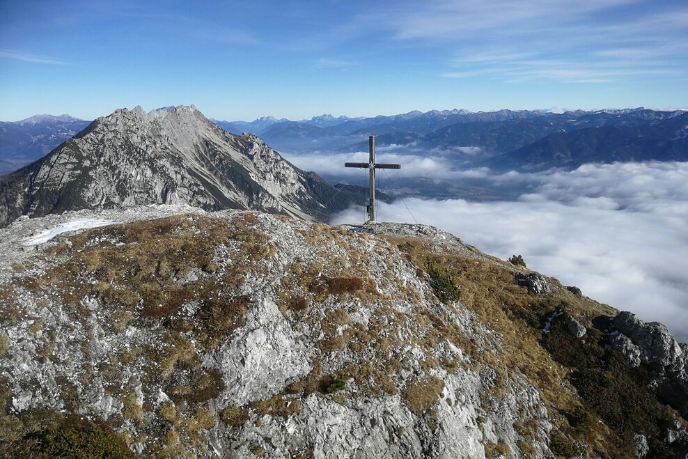 Through a mountain pine alley you now hike up over the tree line - from the right some exits of via ferrata routes connect to the hiking trail. Finally you hike comfortably over the tree-free heights to the summit, which invites you to linger and enjoy. A 360° panorama with a particularly attractive view of the Dachstein glacier and the karst plateau "Am Stein". To the east you can see the wide valley basin of Gröbming, which is impressively towered over by the rocky jagged ridge of the Kammspitze, which looks very close.