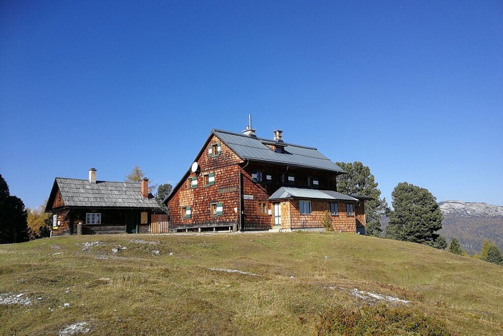 For the descent, hike back a little from the summit and then turn right onto trail #675, which takes you through the mountain pines and over a few switchbacks through the forest down to the Brünnerhütte (not serviced). From there you hike slightly uphill back to the Stoderhütte and the Steinerhaus and along the known path back to the starting point at the Rosemi Alm hiking portal.