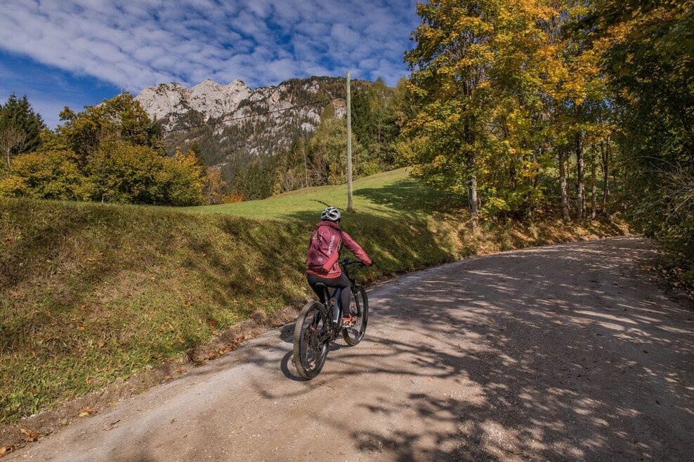 The Storn Alm is not serviced but offers breathtaking views of the Schladming-Dachstein holiday region. After a well-earned break, the route leads back via Gsengwand, Burgstaller, and Passeck to Weißenbach. From Weißenbach, riders have the option to take the fee-based singletrack, which is free for Sommercard holders. Alternatively, the tour can be continued on the regular road back to the starting point at the Hauser Kaibling valley station.