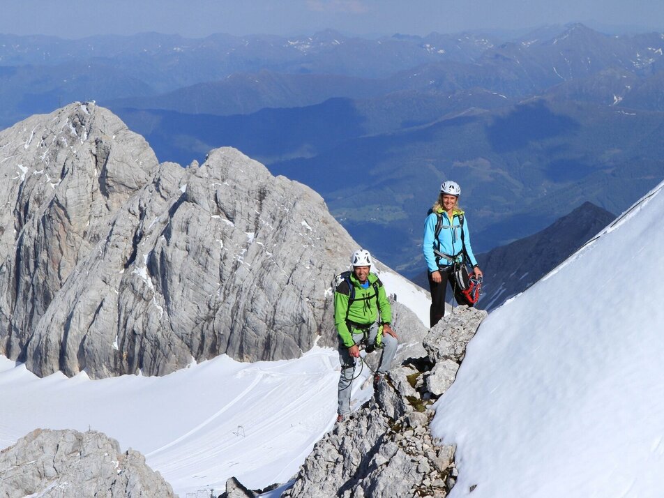 The Amon Klettersteig provides a connection between the Adamek- and Simonyhütte. A very rewarding, though high-alpine via ferrata that should not be underestimated, with approach/descent across the glacier. Aside from alpine experience and good physical condition, glacier equipment is also essential.