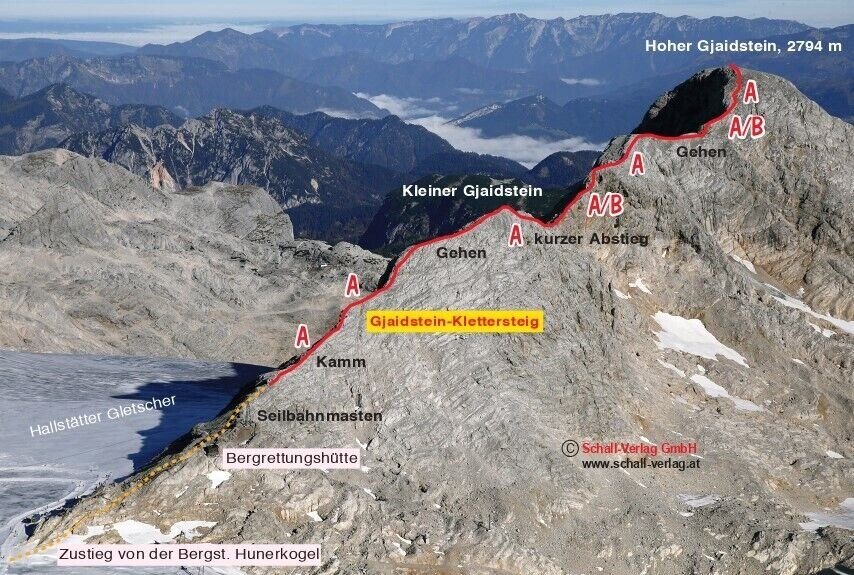 Very beautiful, easy and well-secured summit ascent to one of most scenic lookout points close to the Dachstein cable car. The via ferrata leads you along the mostly not-too-steepsouth ridge of the Hoher Gjaidstein in the process. The ridge hike to the Kleiner Gjaidstein is eas,with some passages providing permanent safety features.